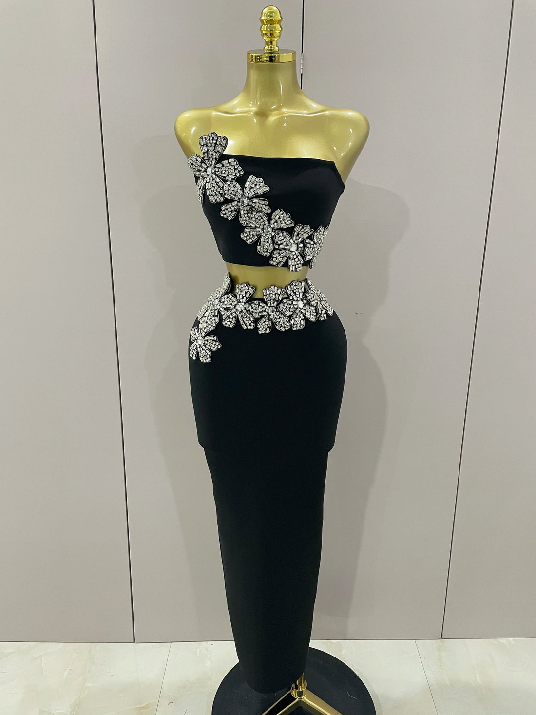 Sexy Strapless Flower Diamonds Black Maxi Long Bandage Two Piece Set Women Knitted Elegant Evening Club Party Prom Gowns