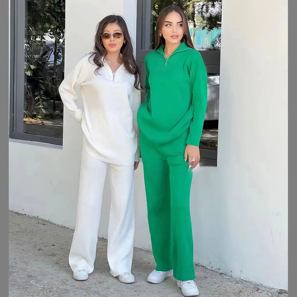 2024 Casual Autumn Loose Knit Sweater Set Fashion Zip Lapel Long Sleeve Pullover Sweater & Straight Pants Two-piece Set