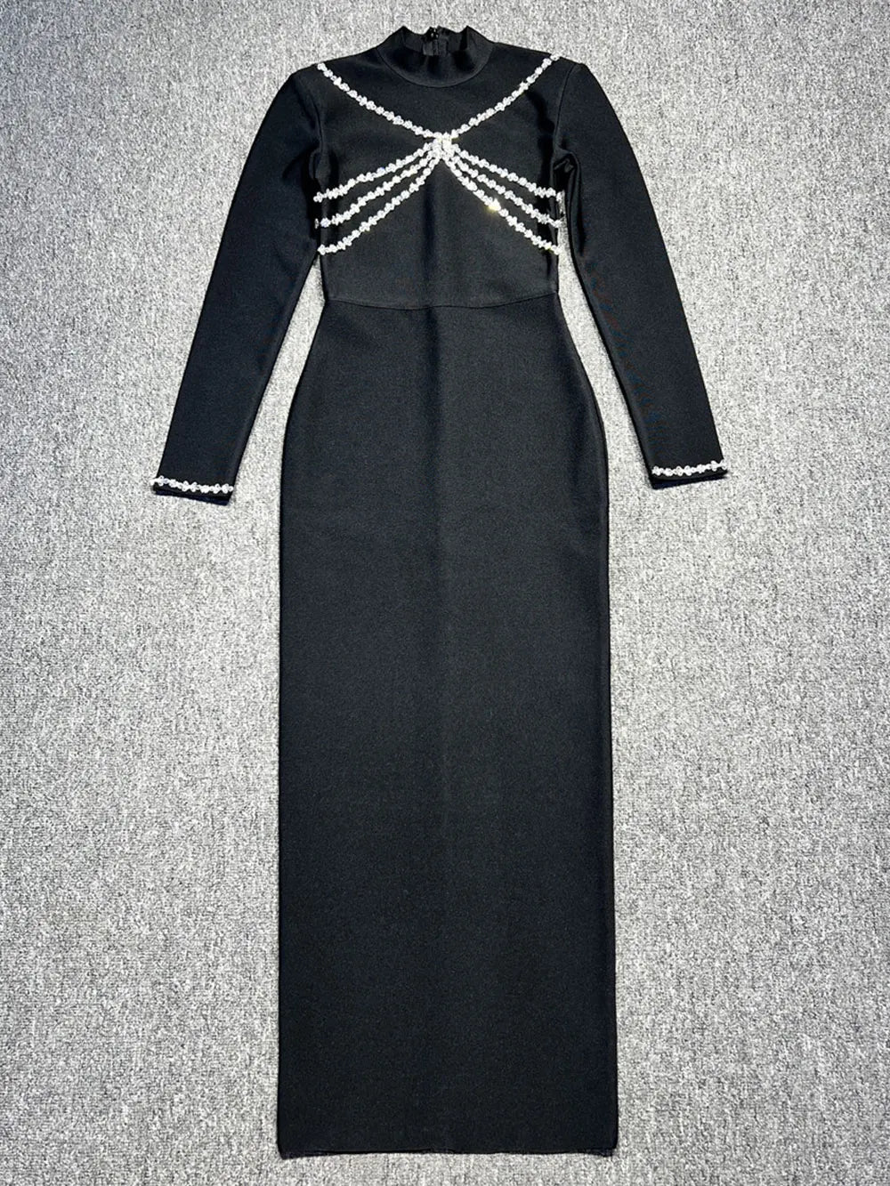 2024 Elegant Women Light Luxury Diamond Set Bandage Dress with Stand Collar Long Sleeve Bodycon Long Dress Evening Party Vestido