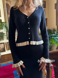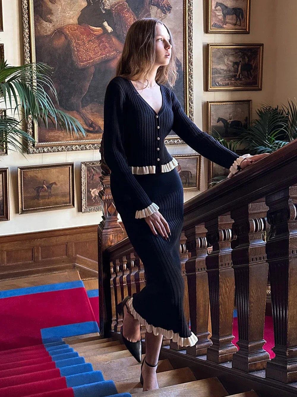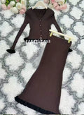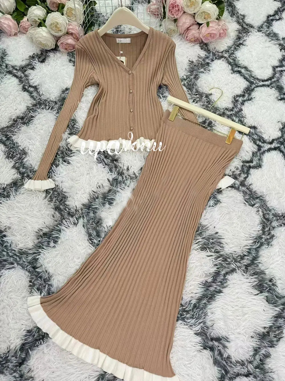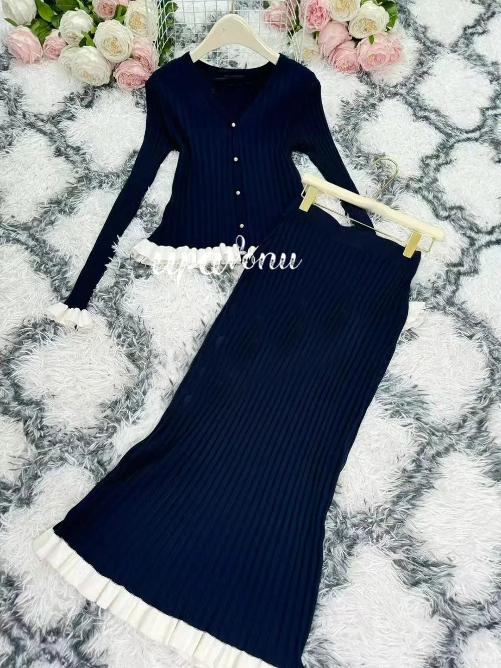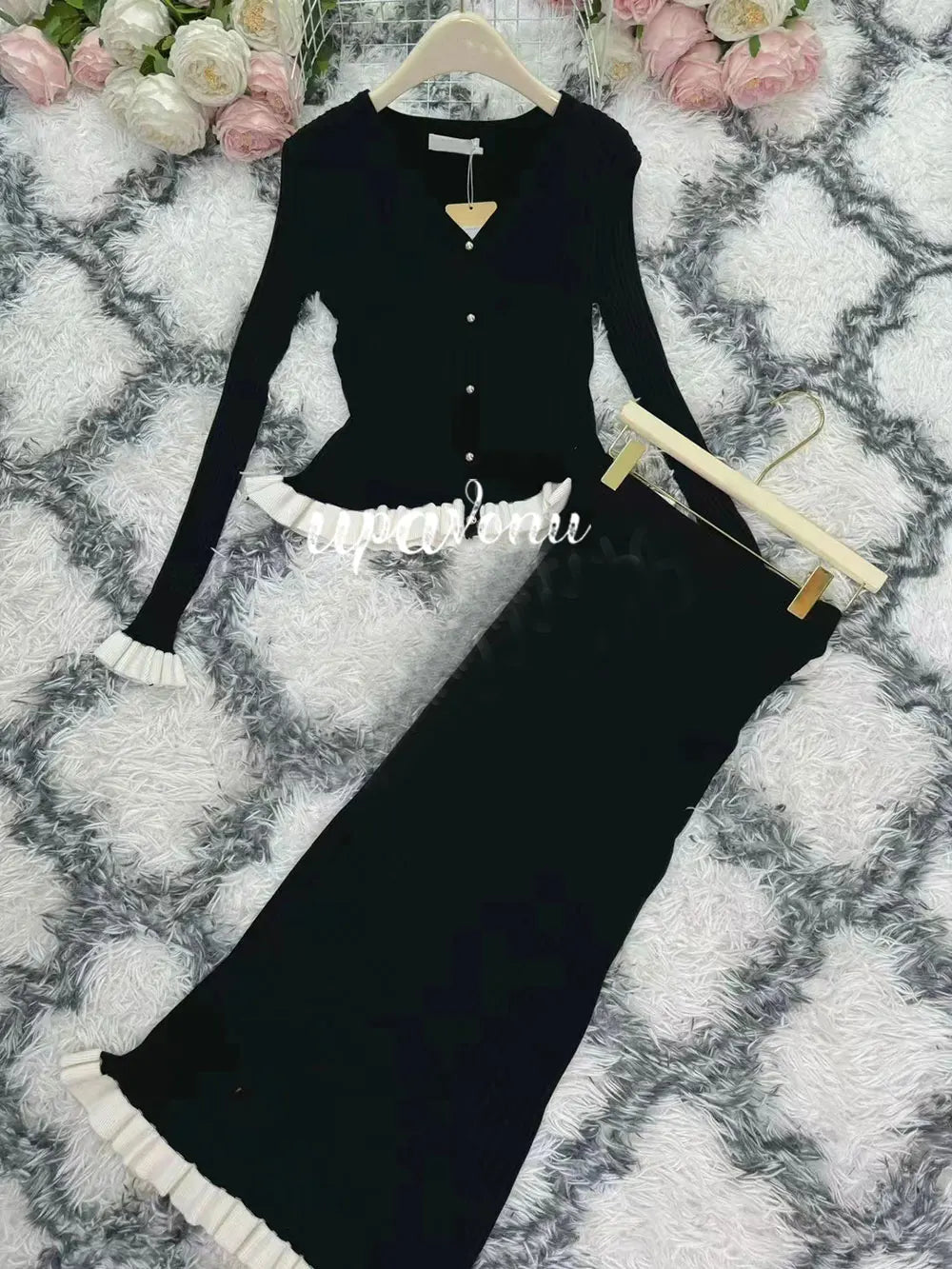 2024 Knitted Long Skirt Set Long sleeved Wooden Ear Edge Single breasted Cardigan Knitted Coat+High Waist Skirt Two piece Set