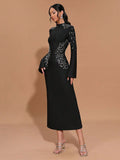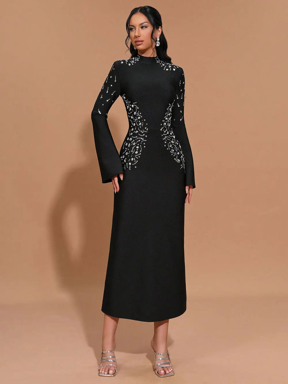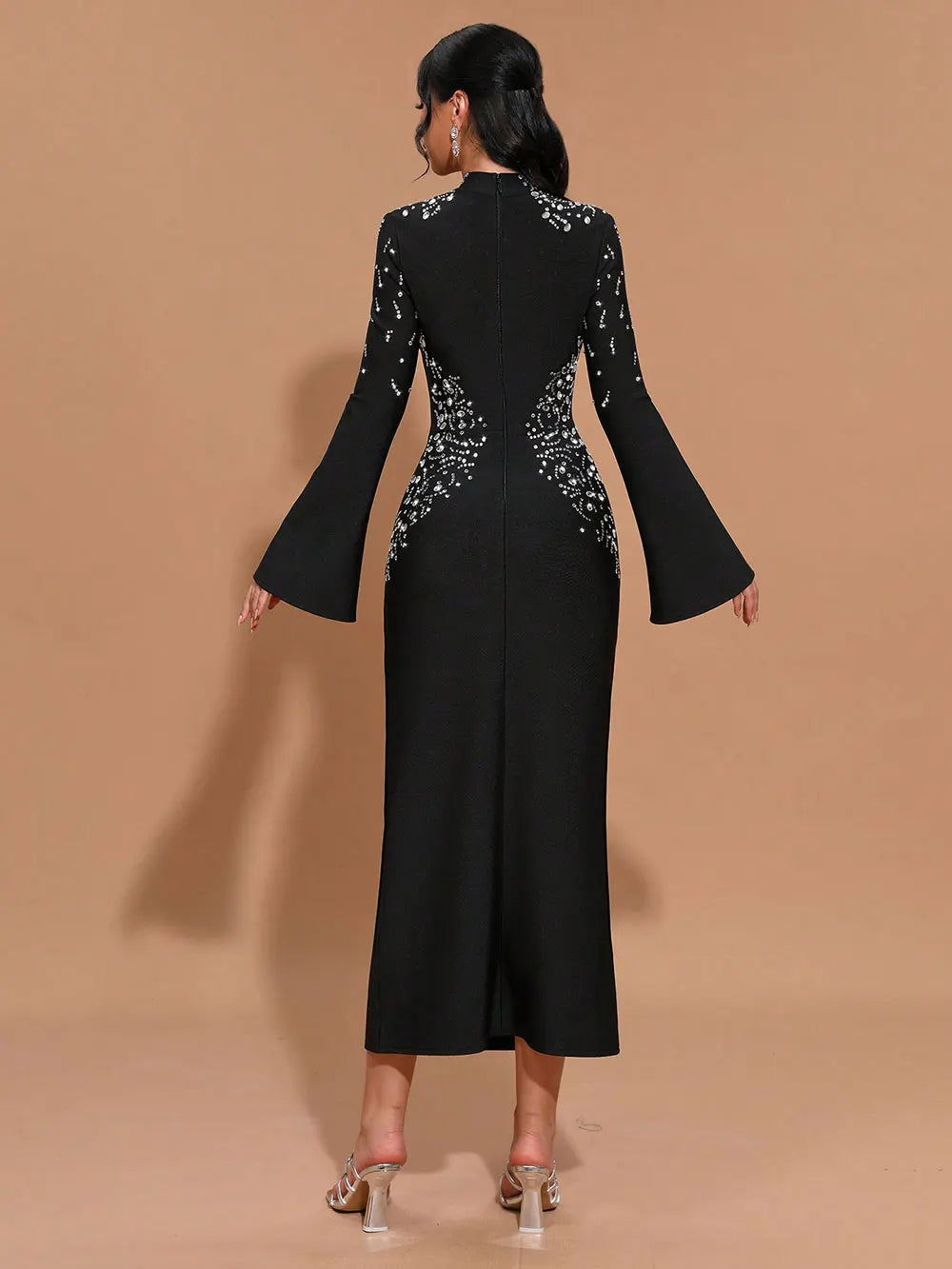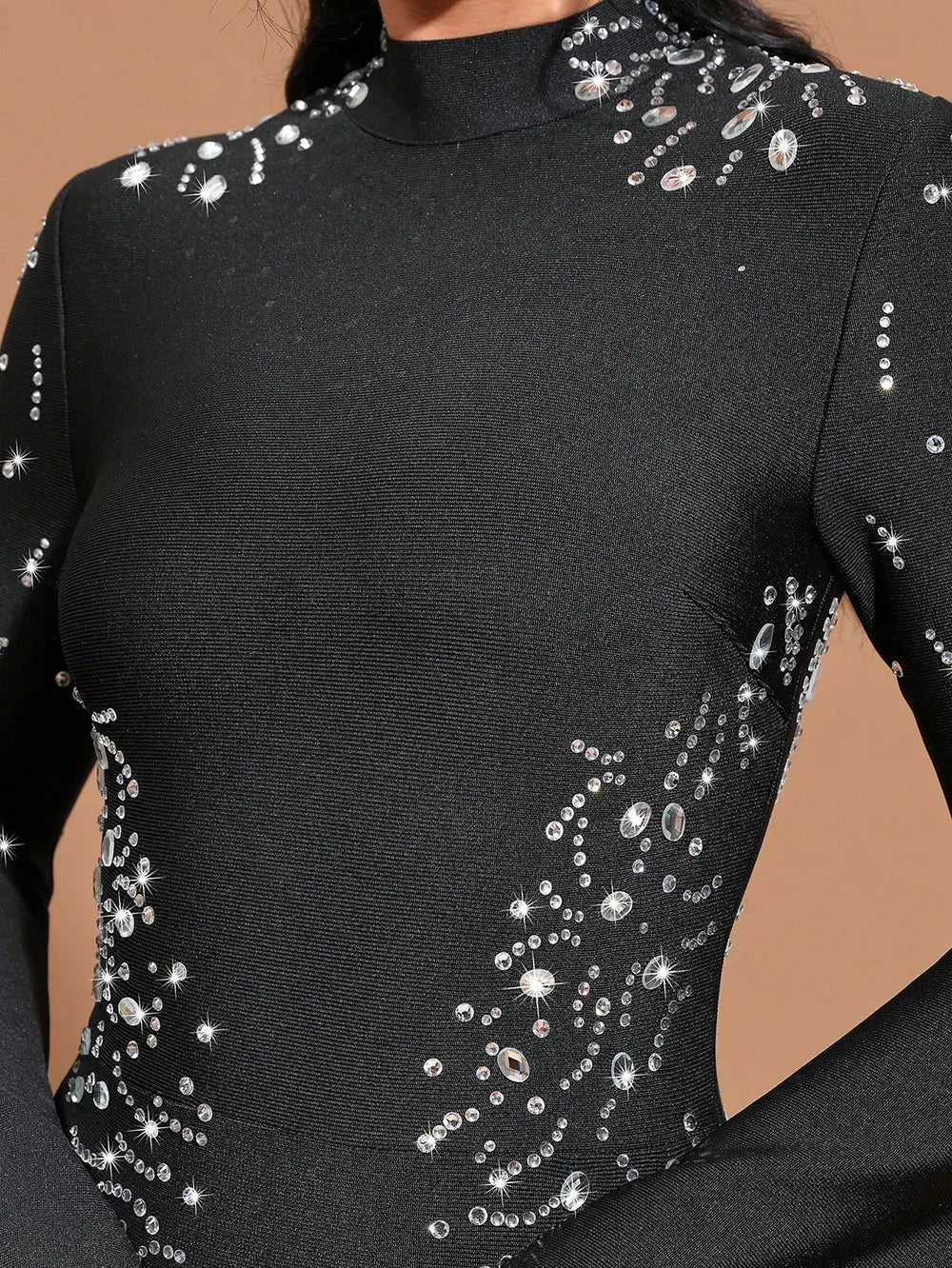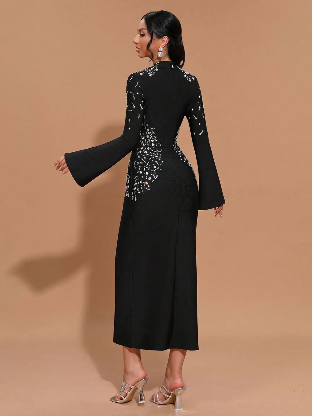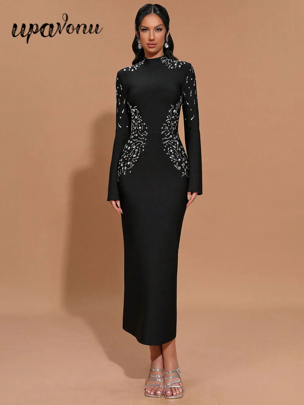 2025 Elegant Women's Light Luxury Hot Diamond Bandage Dress with Stand up Collar and Trumpet Sleeve Bodycon Long Dress Vestidos