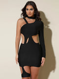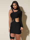 2025 Spring Women's Sexy Asymmetric Bandage Dresses Stand Collar Single Shoulder Long Sleeve Bodycon Hollow Mini Dress Vestidos