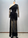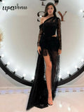 2025 Women's Light Luxury Lace Maxi Dress Diagonal Collar Lace Long Sleeve Bodycon Draped Split Sexy Long Dresses Party Vestidos