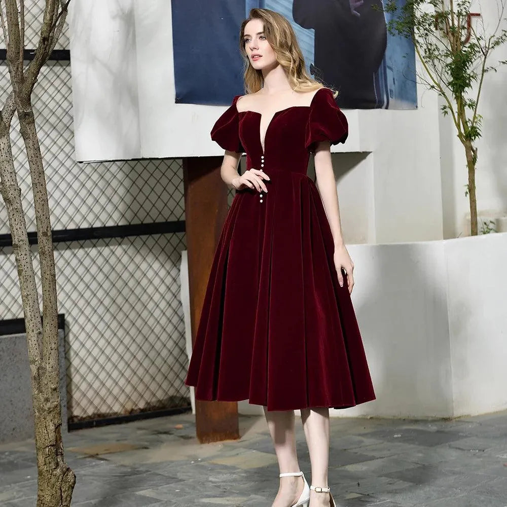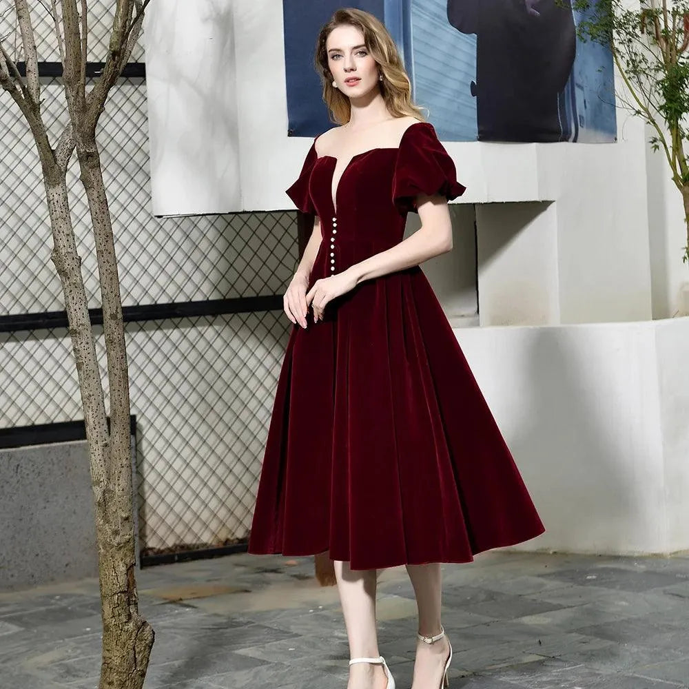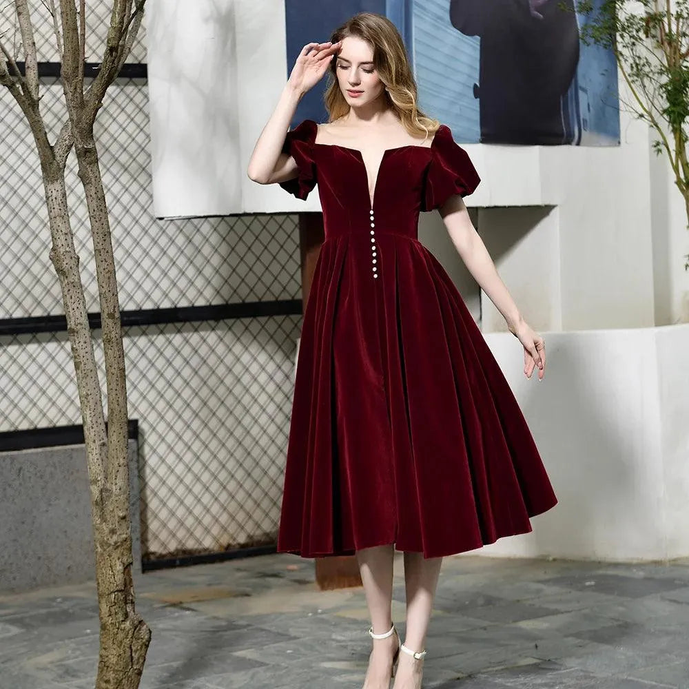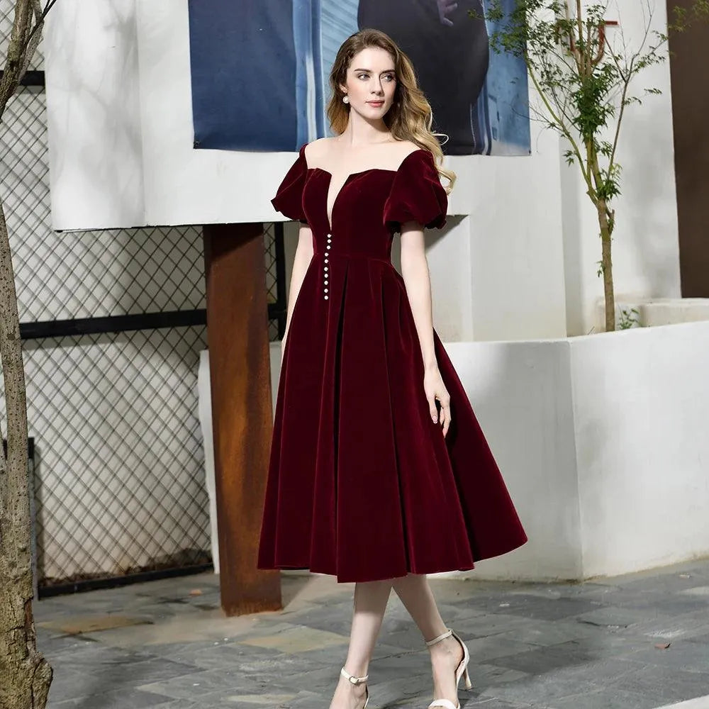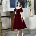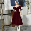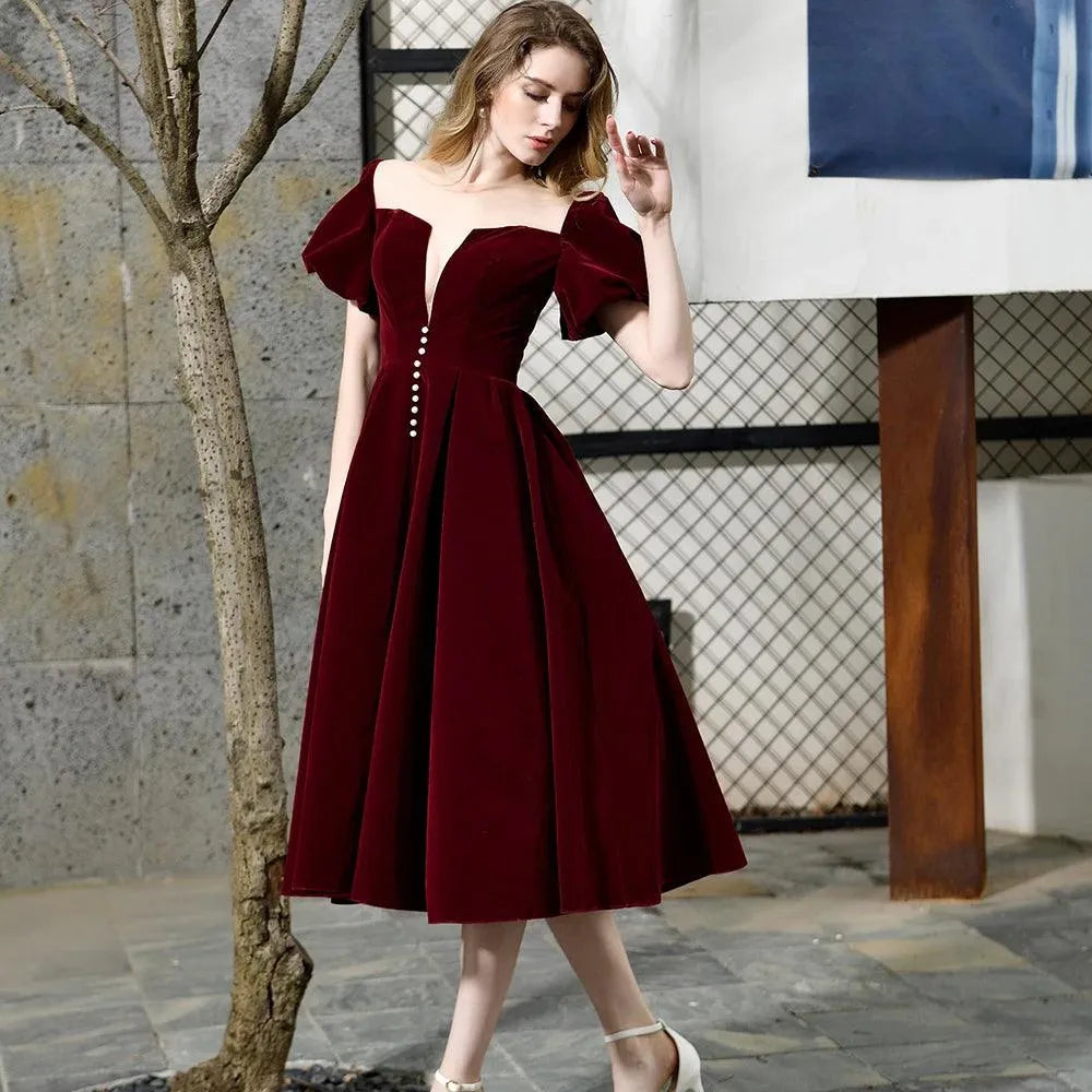 Aangepaste nieuwe bordeauxrode avondjurk galajurken velours doorschijnende hals A-lijn kapmouwen enkellange galajurk