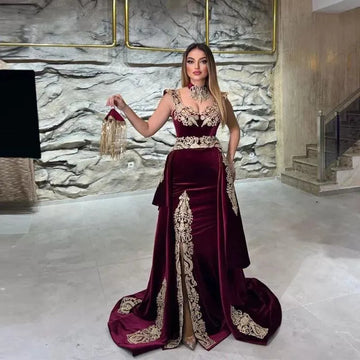 Donkere bordeauxrode fluwelen zeemeermin avondjurken afneembare sleep lieverd kant applicatie Dubai kaftan vrouwen galajurken