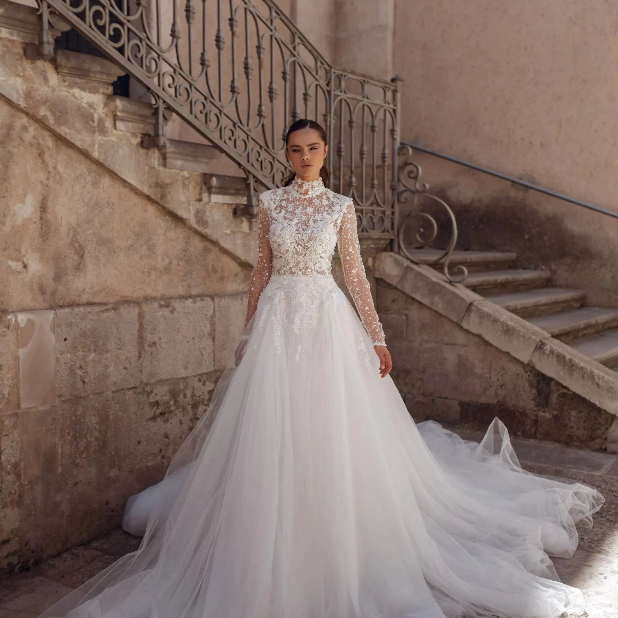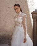 Elegante A-lijn trouwjurk met paillettenkant, hoge halslijn en lange mouwen voor een verfijnde en tijdloze bruidslook