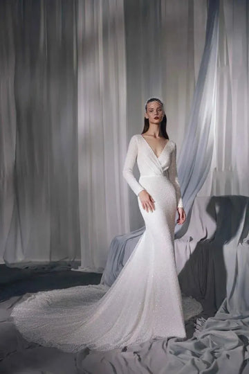 Elegante minimalistische A-lijn trouwjurk met lange mouwen, V-hals, kantversieringen en natuurlijke taille voor een verbluffende look