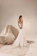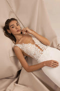 Elegante minimalistische trouwjurk met delicate kant, subtiele pailletten en bloemenapplicaties voor een verfijnde en tijdloze bruidslook