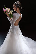 Elegante moderne trouwjurk met lange mouwen, V-halslijn en ingewikkeld kant in een flatterend zeemeerminsilhouet voor een verfijnde en tijdloze bruidslook