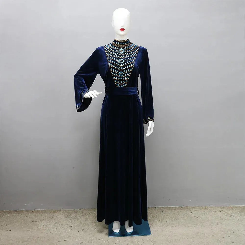 Autumn Velvet Warm Fashion Muslim Women Diamond Abaya Long Maxi Dresses Dubai Kaftan Turkey Arab Islamic Eid Party Gown Jalabiya Blue
