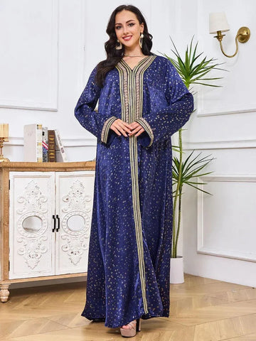 Islamitische dameskleding Elegante etnische abaya-jurk met ruitenbandversiering, lange mouw, V-hals, casual losse jurk, golf