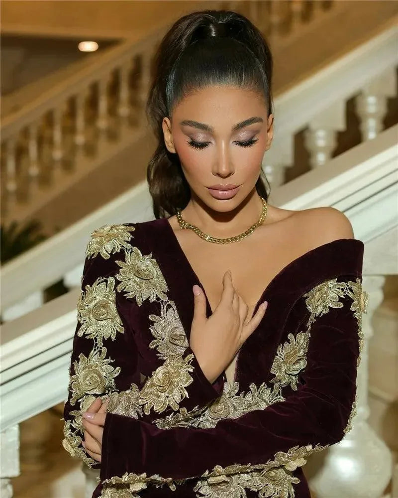 Lange mouwen zeemeermin kaftan avondjurken V-hals kant galajurk vloer lengte formele feestjurk
