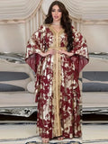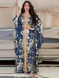Luxe dames Jalabiyat Marokkaanse Kaftan Abaya Dubai Print V-hals Guipure Kant Tape Riem Jurk Islamitische Jurken Voor Vrouwen