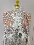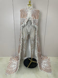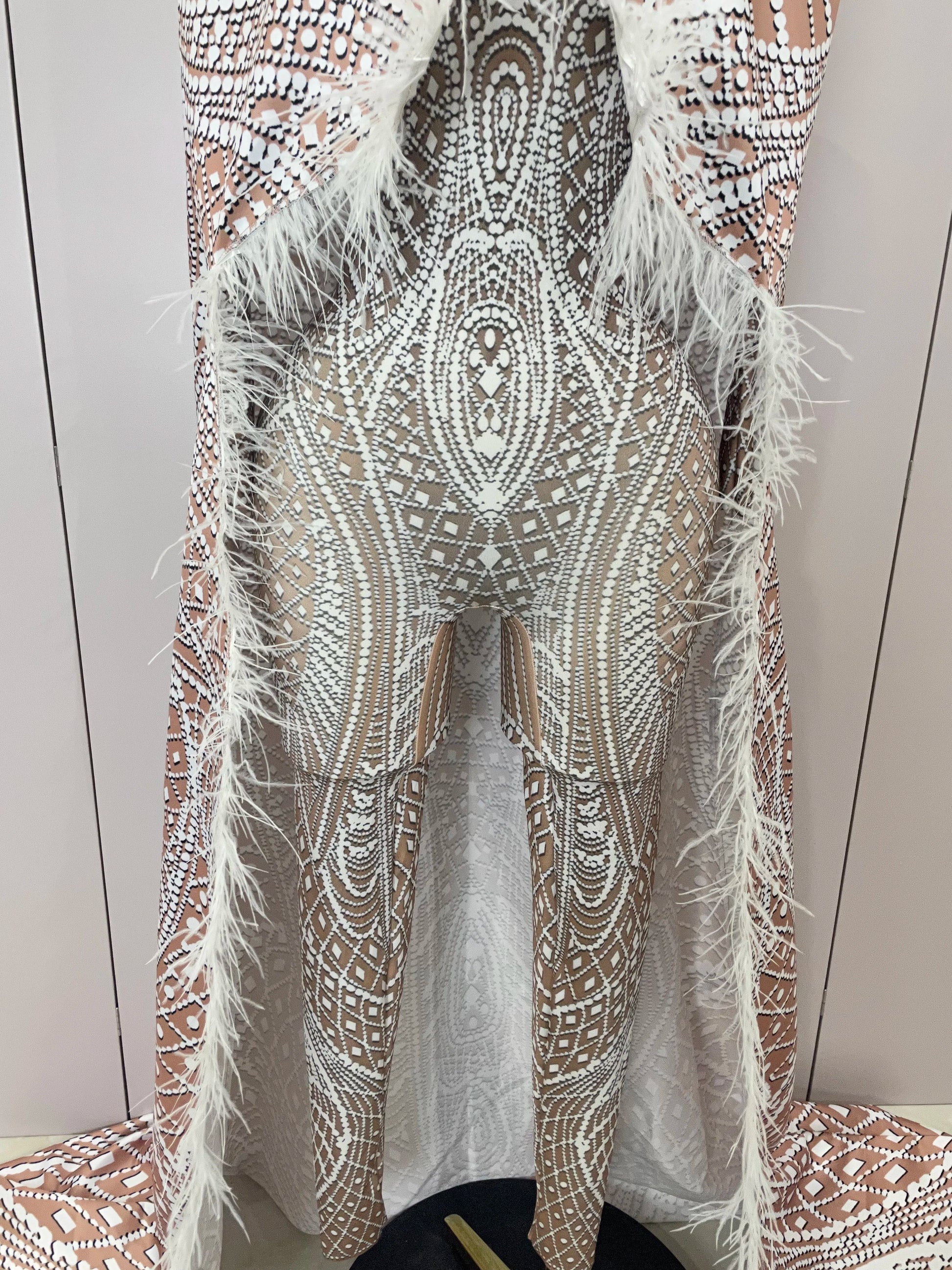 Luxury Feathers Cloak White Printing Sexy Sheath Jumpsuit Women Evening Party Bar Nightclub Singer Stage Performance Costume