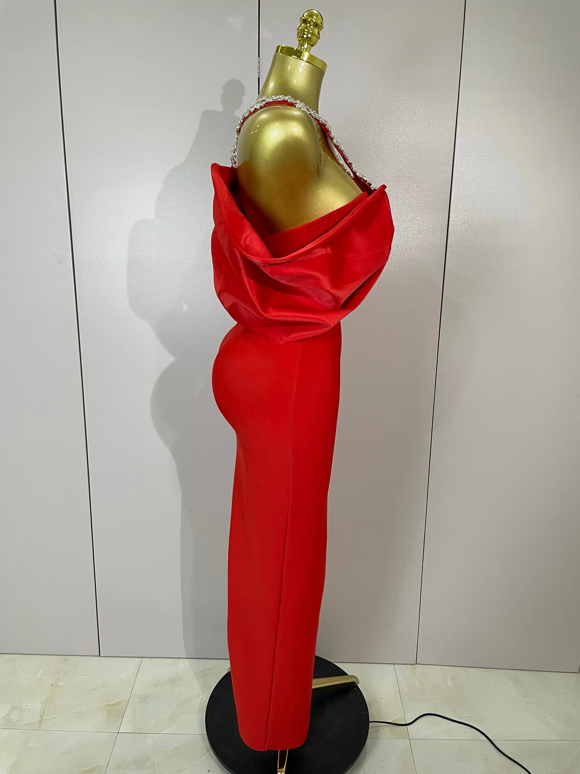 Luxury Rhinestone Chain Red Off Shoulder Vintage Butterfly Chic Bodycon Long Dress Elegant Evening Party Birtyday Clothing
