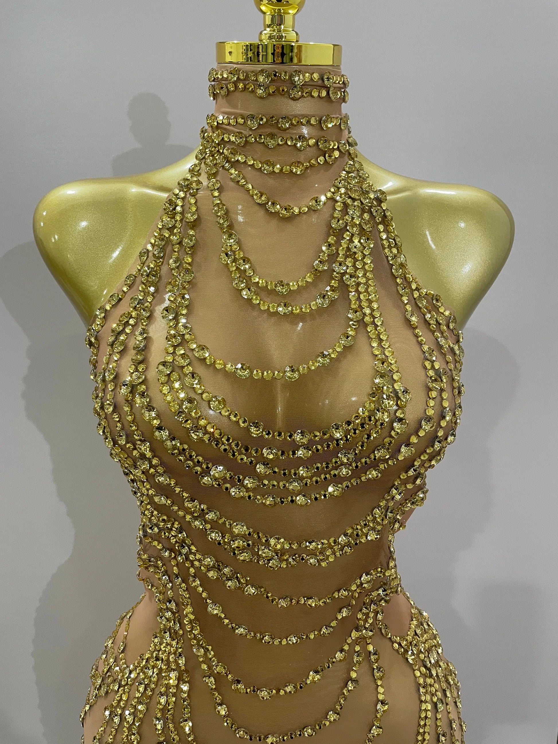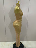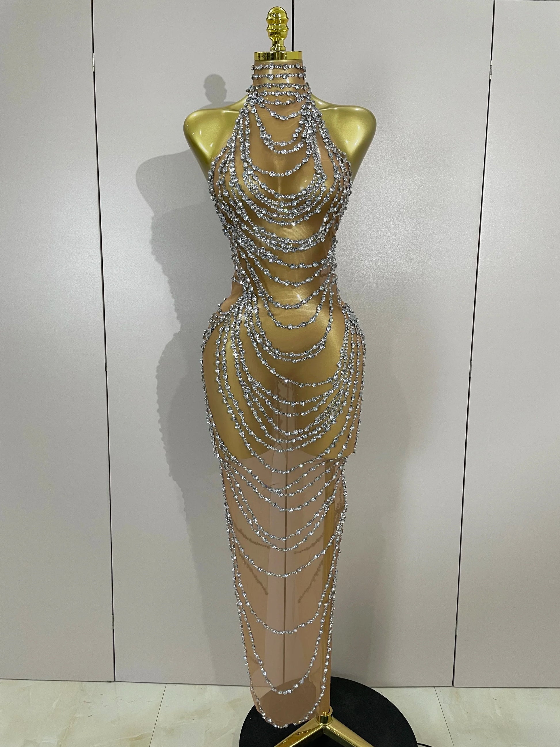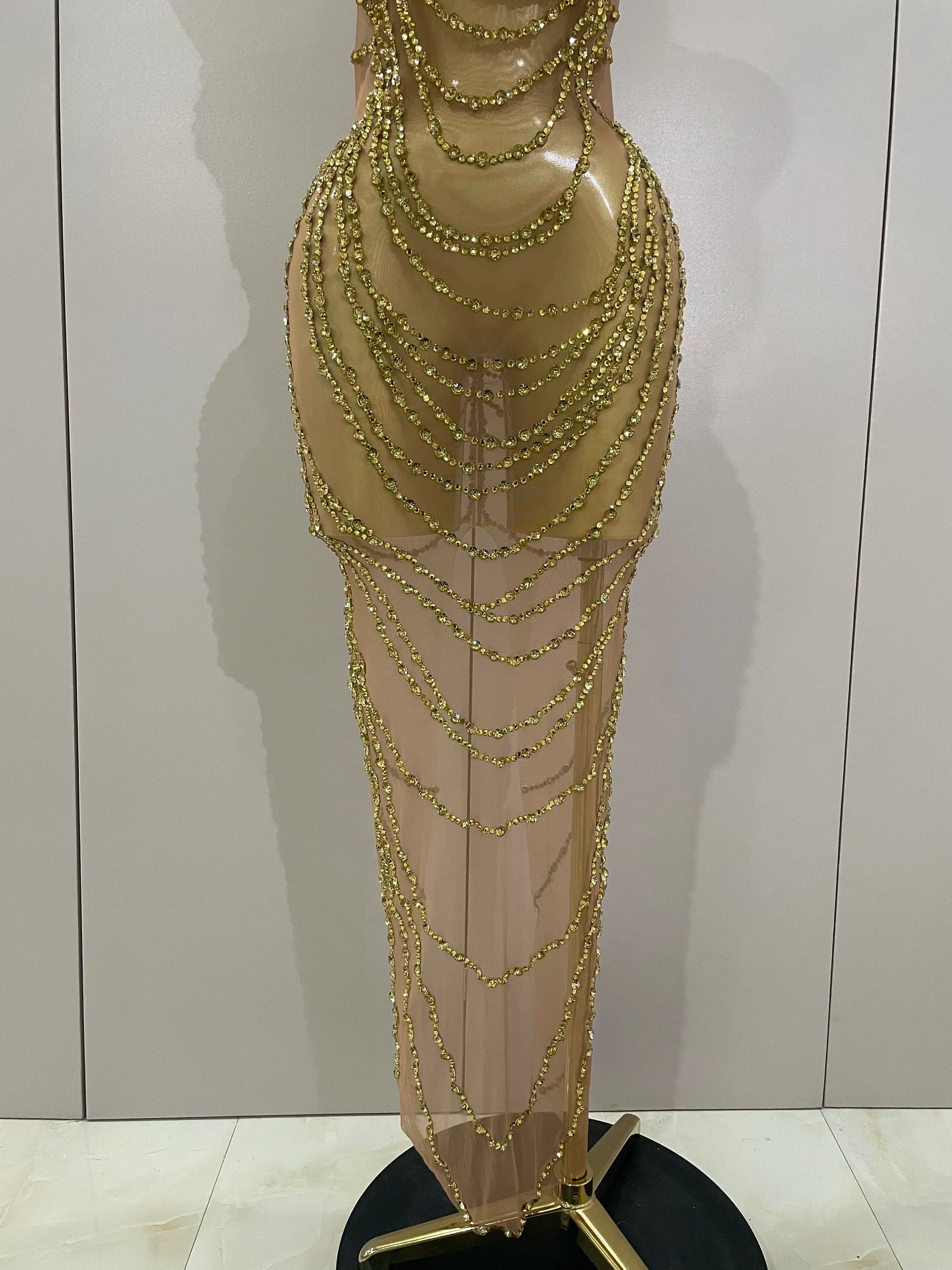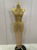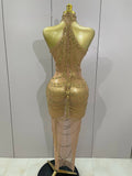 Luxury Sparkly Gold Rhinestone Sexy Transparent Mesh Long Dress Women Birthday Party Gown Stage Singer Performance Costume