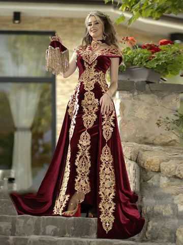 Marokkaanse Caftan Avondjurk Gouden Applicaties Kant Outfit Afneembare Sleep Zeemeermin Fluwelen Arabische Prom Jurken Feestjurk