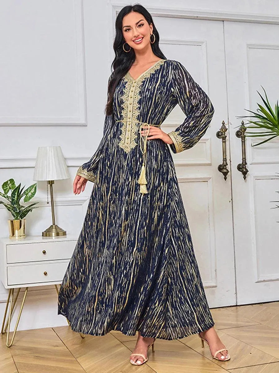 Mode chique lange jurken Marokkaanse abaya's voor vrouwen Volledige mouw V-hals Riem Kleding Elegante Arabische kostuums Vrouw