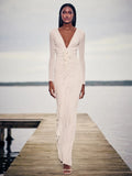 Modphy Sexy V-neck splicing 3D Flower Fold Tight Long Dress Women Long sleeves Solid White 2025 Party Evening Wedding Gowns
