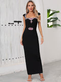 Women Sexy Square Collar Sparkly Crystal Bodycon Bandage Long Dress Birthday Party Celebrate Cocktail Outfit