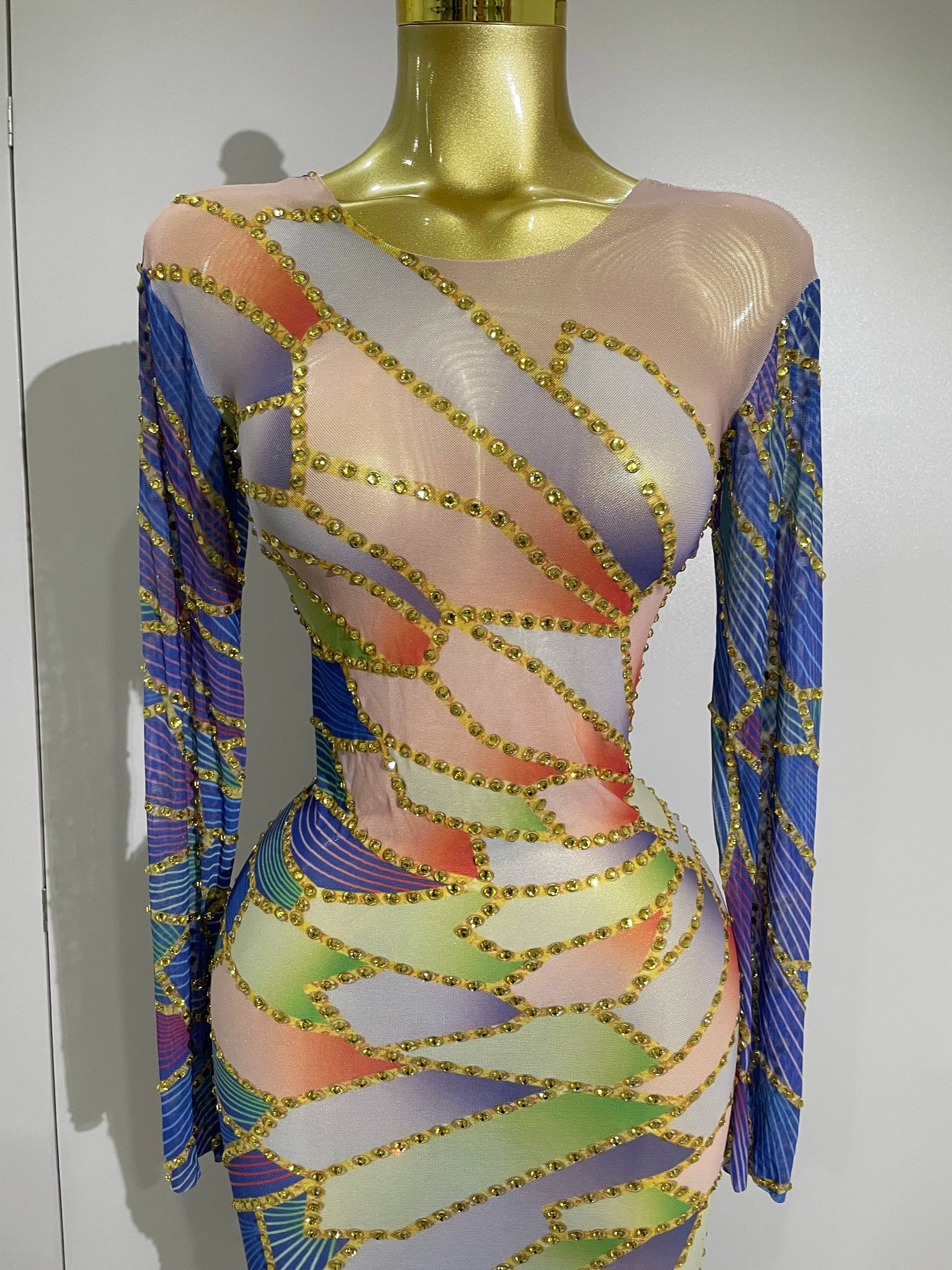 New Luxury Sparkly Rhinestone Stretchy Mesh See Through Long Dress Women Birthday Party Performance Nightclub Stage Costume