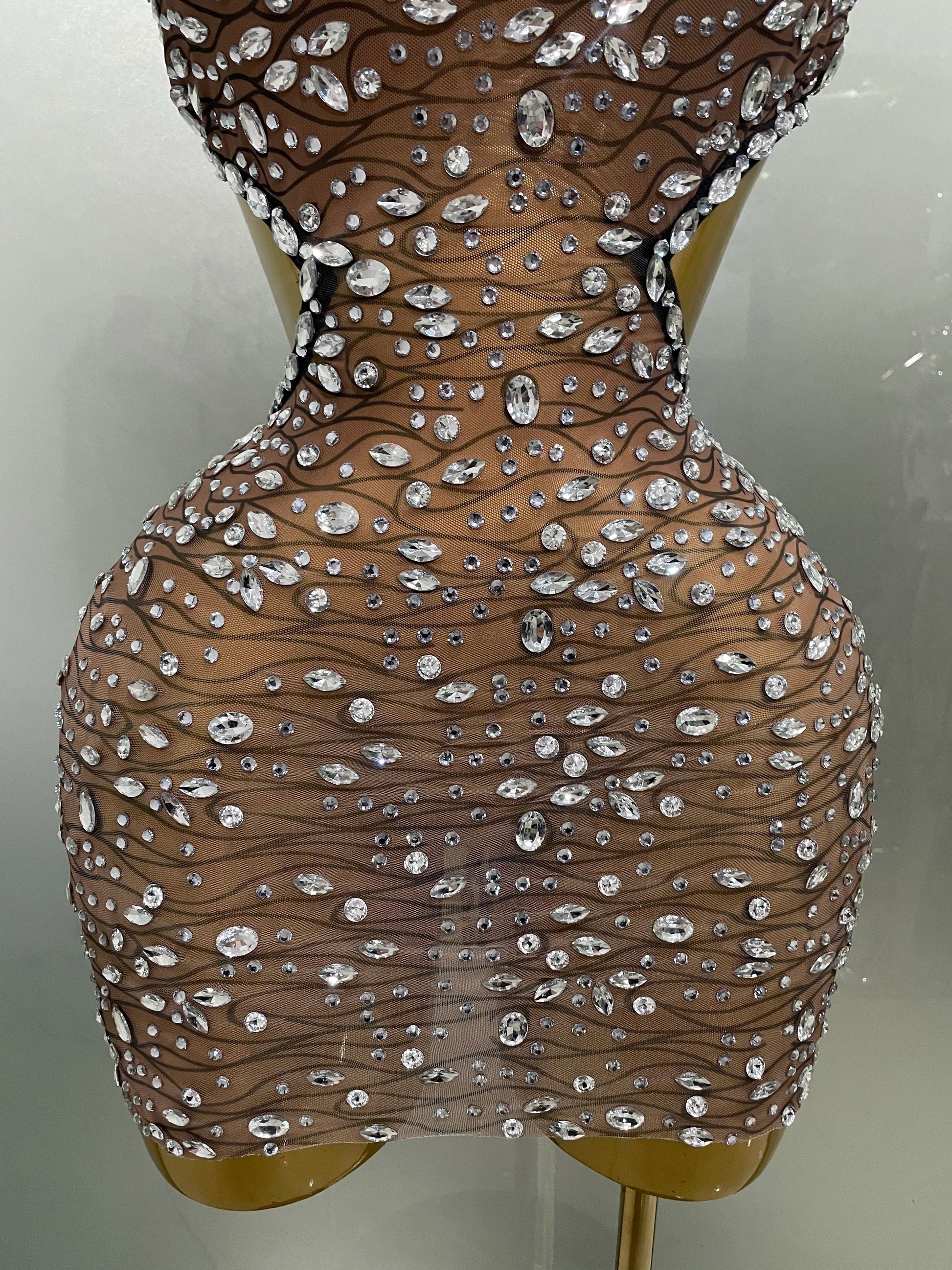 New Sexy Shiny Diamond Hollow Out Backless Short Dress Women Evening Celebrate Prom Birthday Party Nightclub Stage Costume