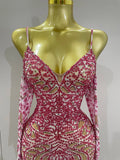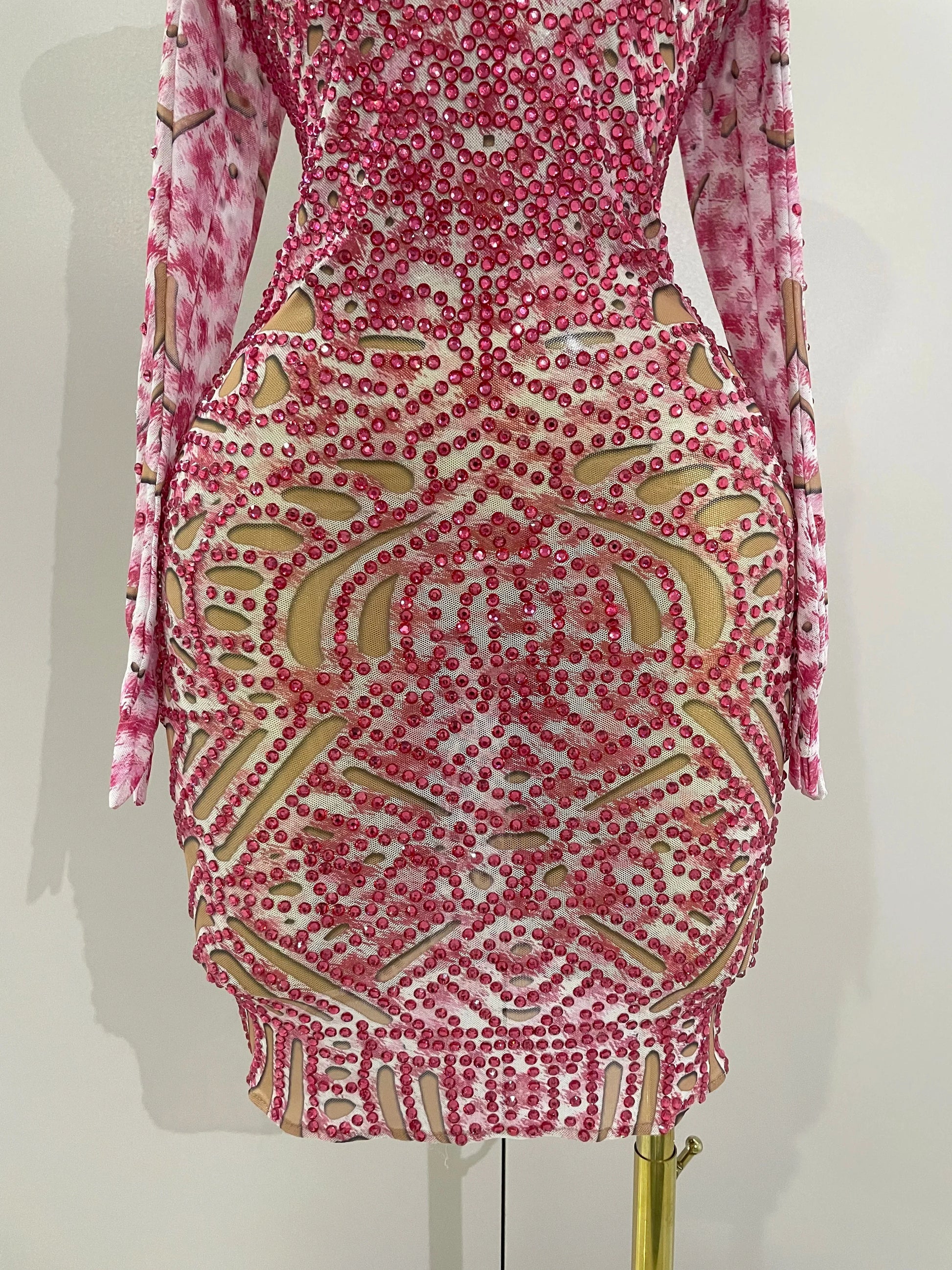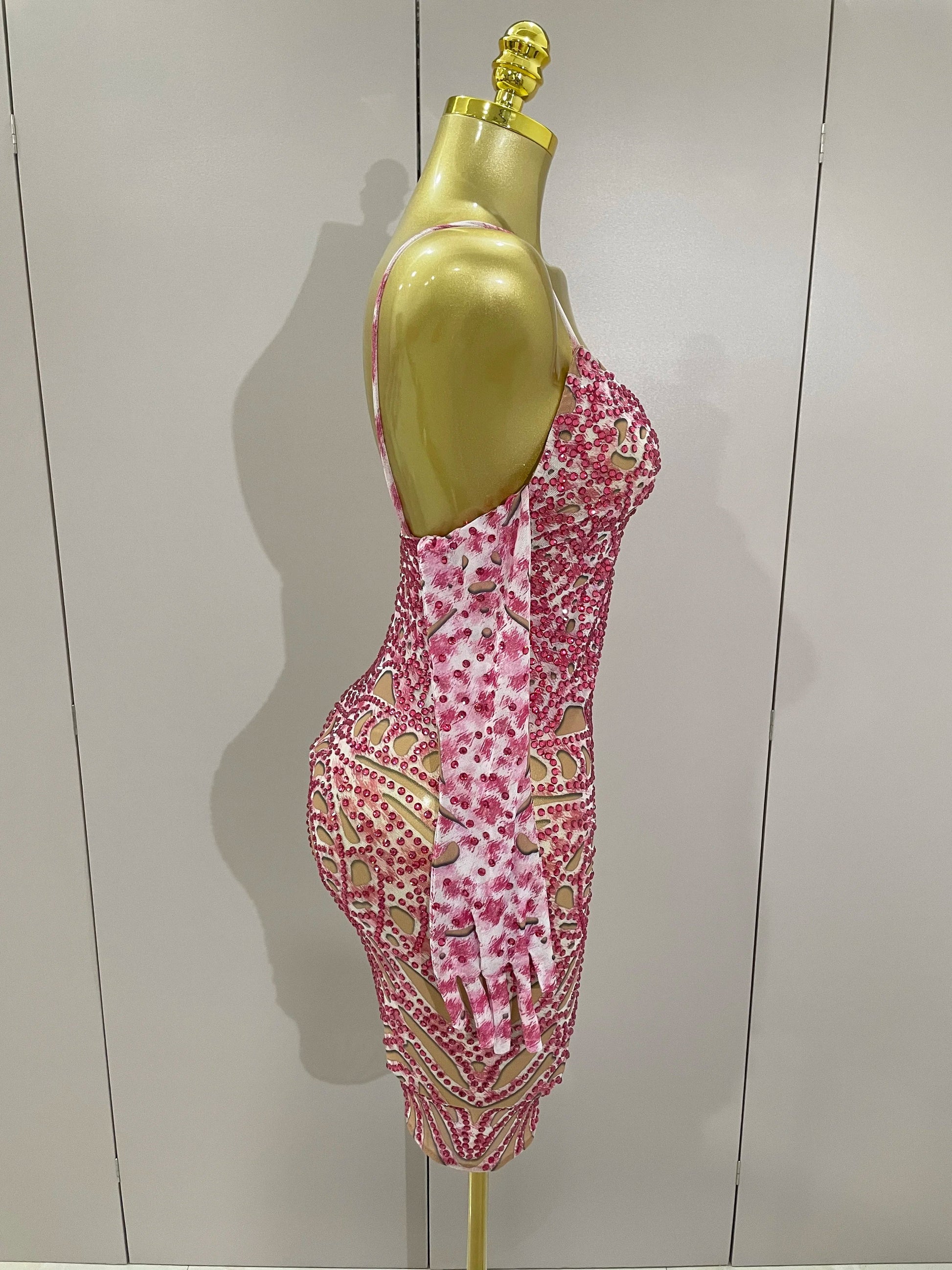 New Sexy Sparkly Rhinestones Mesh Mini Dress With GlovesWomen Evening Birthday Party Celebrate Costume Dancer Stage Wear