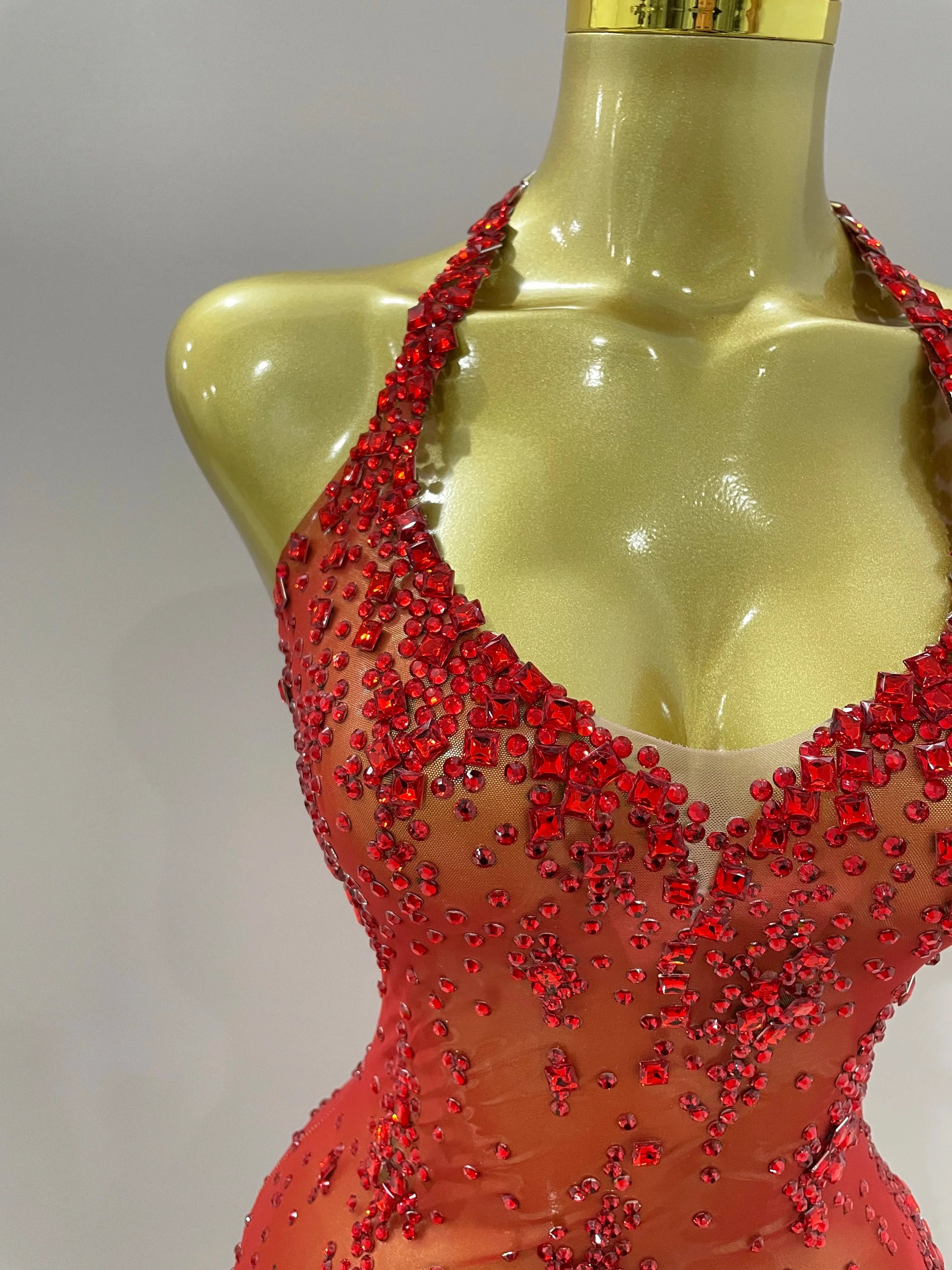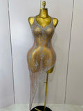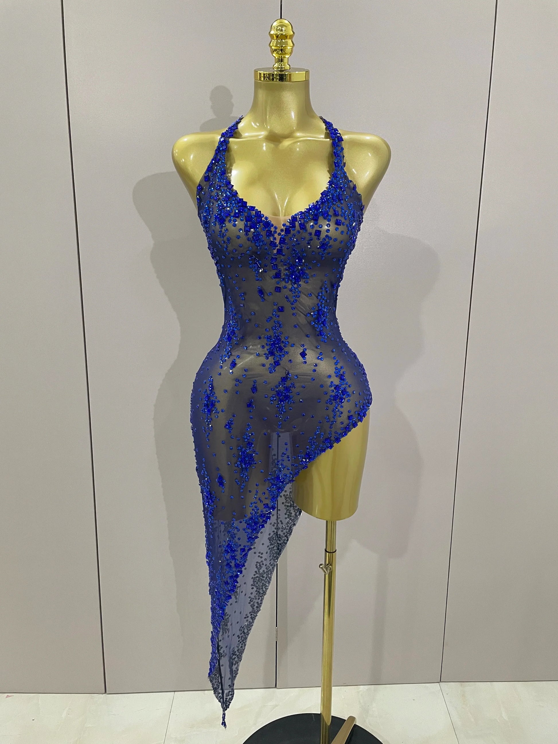 New Sparkly Rhinestone V Neck Stretch Mesh Sexy See Through Dress Women Elegant Party Celebrate Perform Costume Stage Outfi