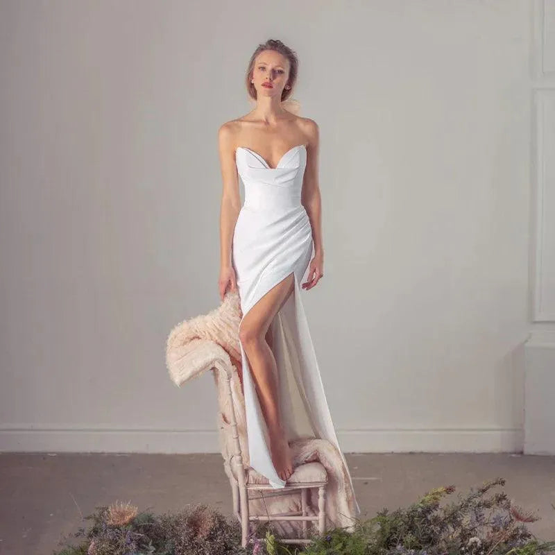 Populaire V-hals Satijnen Schede A-lijn Bruidsjurken Zijsplit Knoopsluiting Rug Boho Strand Bruidsjurken Grown Robe de Mariage