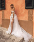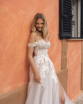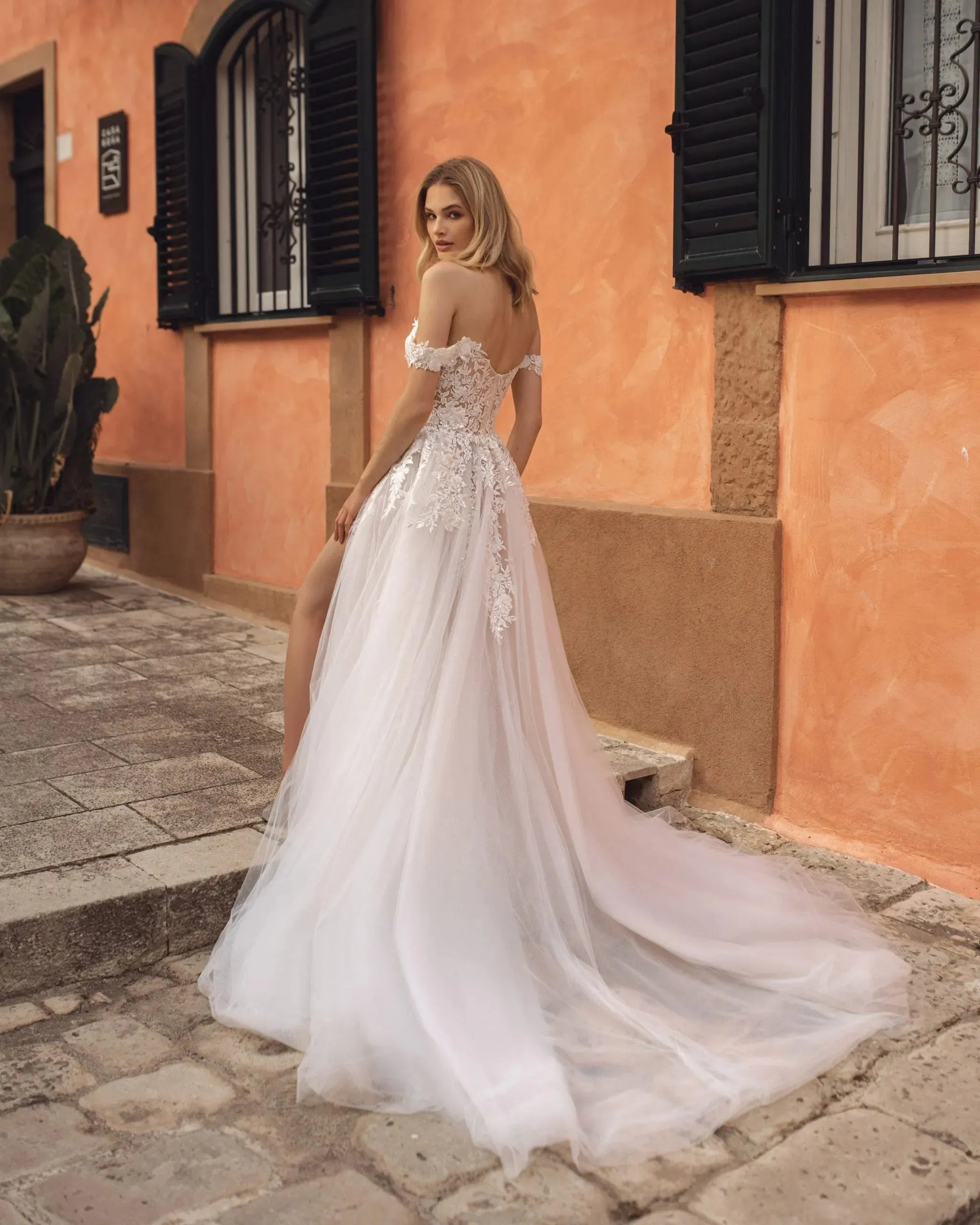 Romantische A-lijn trouwjurk met off-shoulder mouwen en een flatterende natuurlijke taille voor een betoverende en tijdloze bruidslook