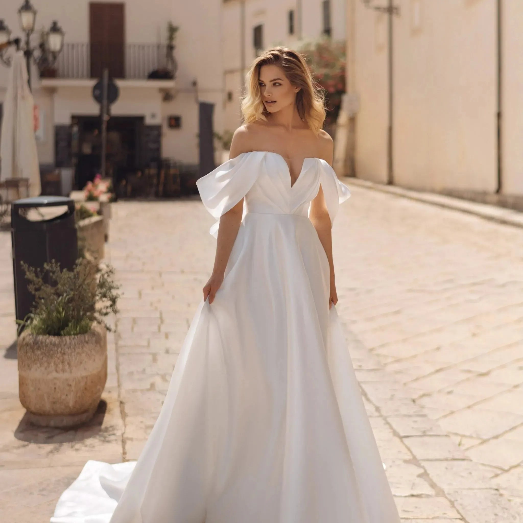 Romantische A-lijn trouwjurk, off-shoulder mouwen en een flatterende natuurlijke taille voor een betoverende bruidslook