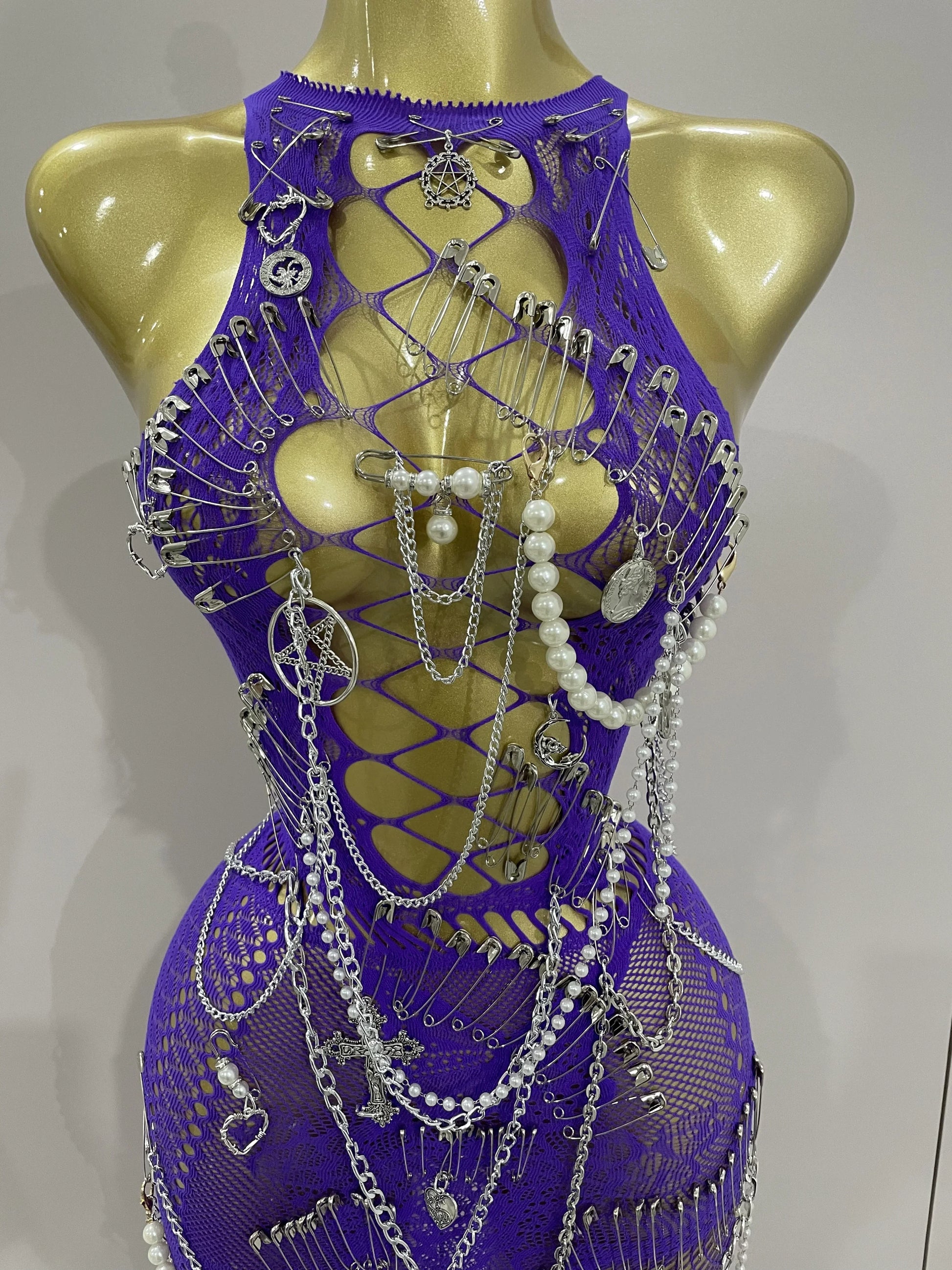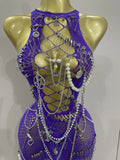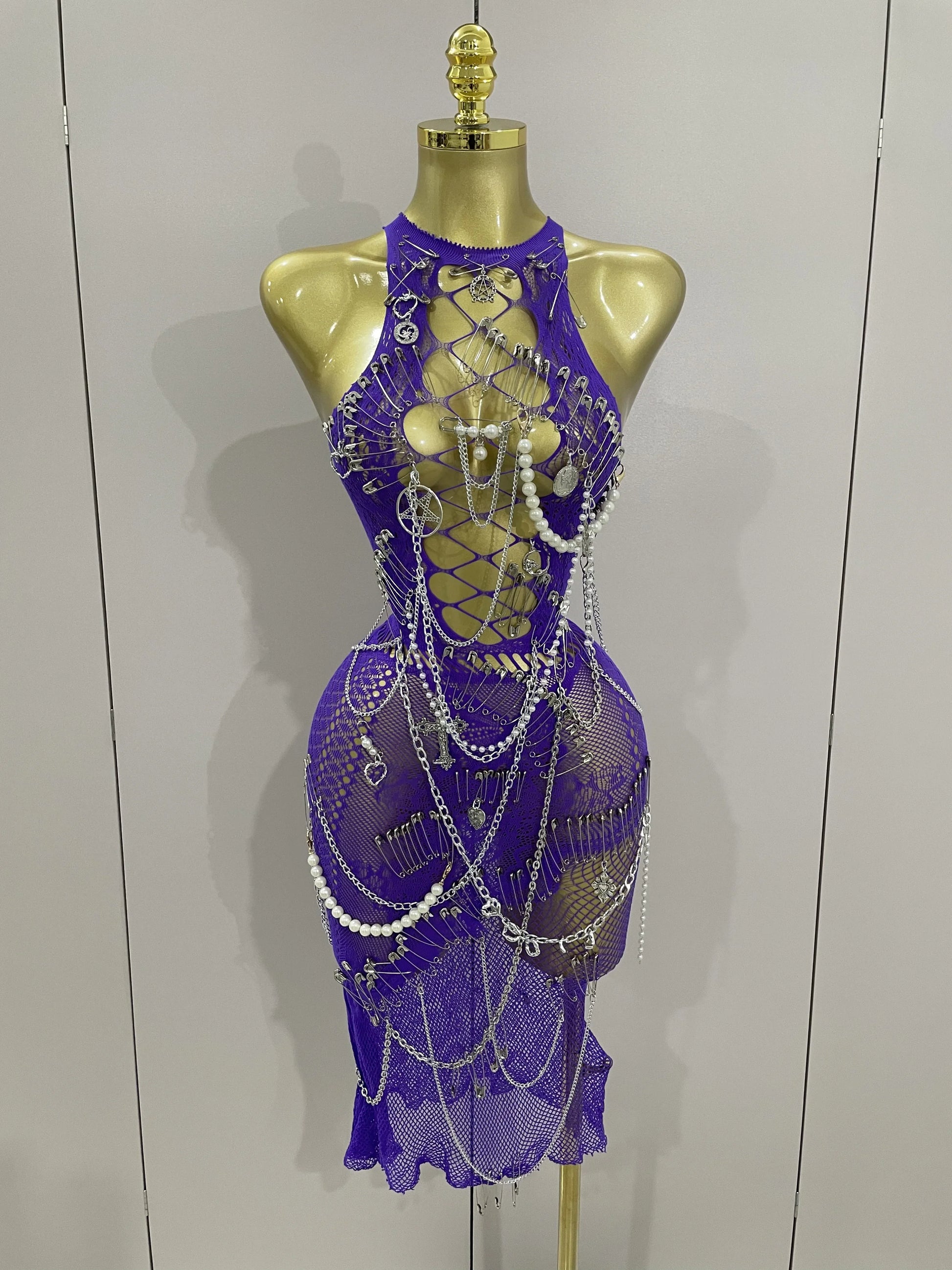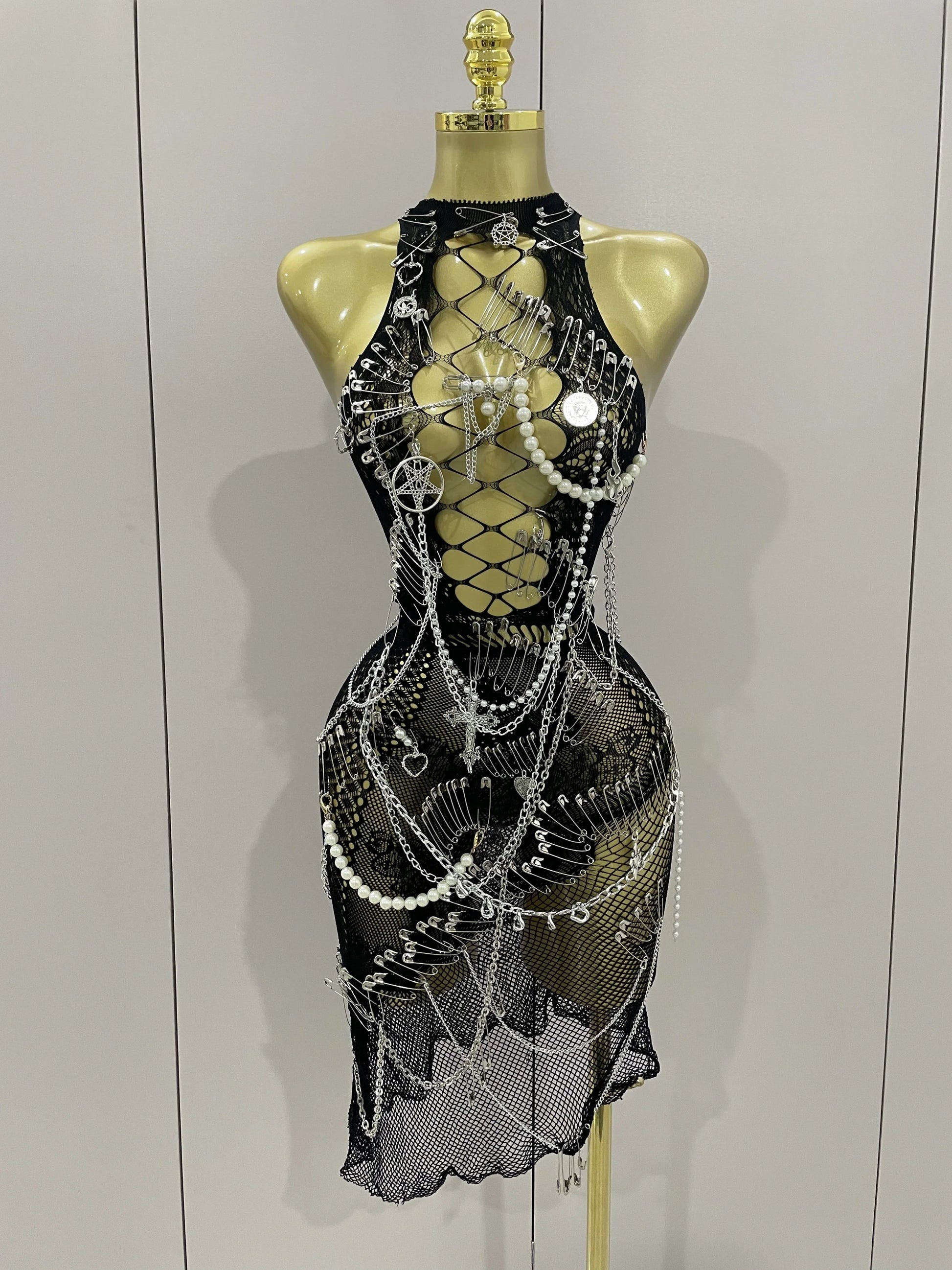 Sexy Black See-Through Pin Decoration Chain Beading Short Dress Women Birthday Evening Party Nightclub Performance Costume