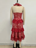 Sexy Lace Midi Halter Dress Women Red Ruffle Backless Sleeveless Party Dresses 2025 Summer Lady Vacation Robes New