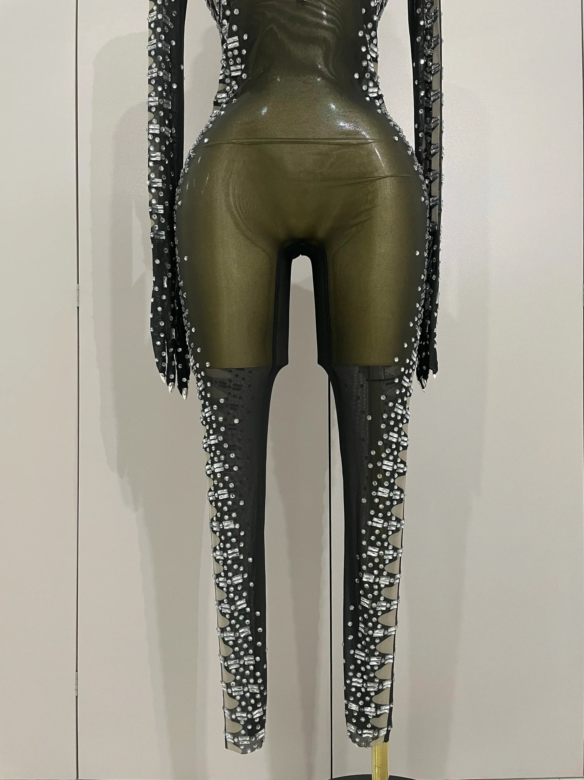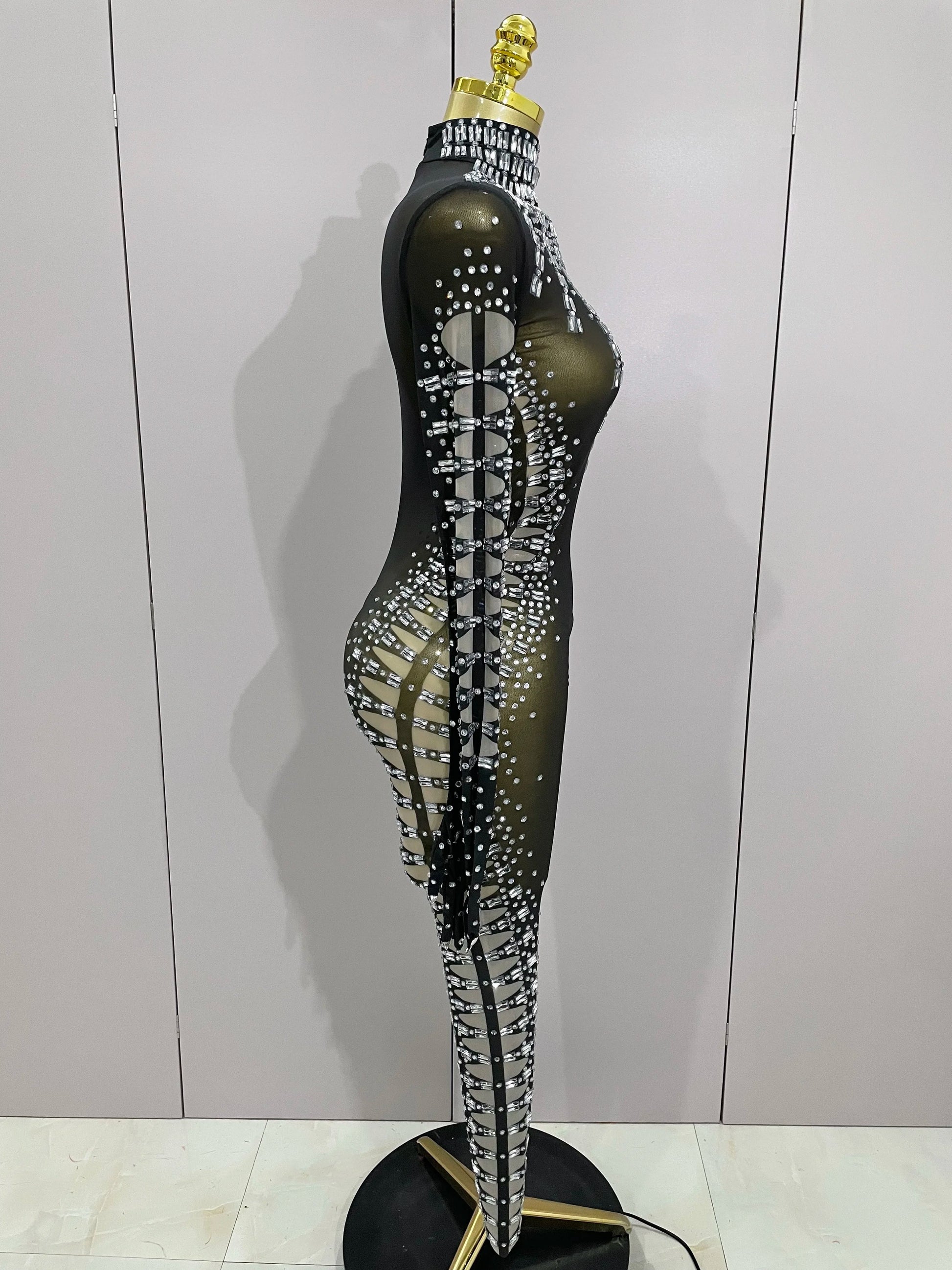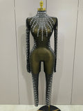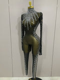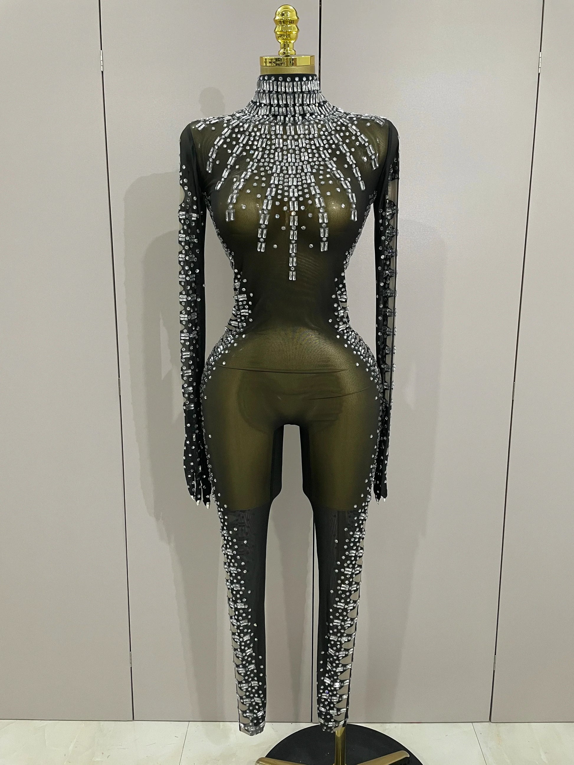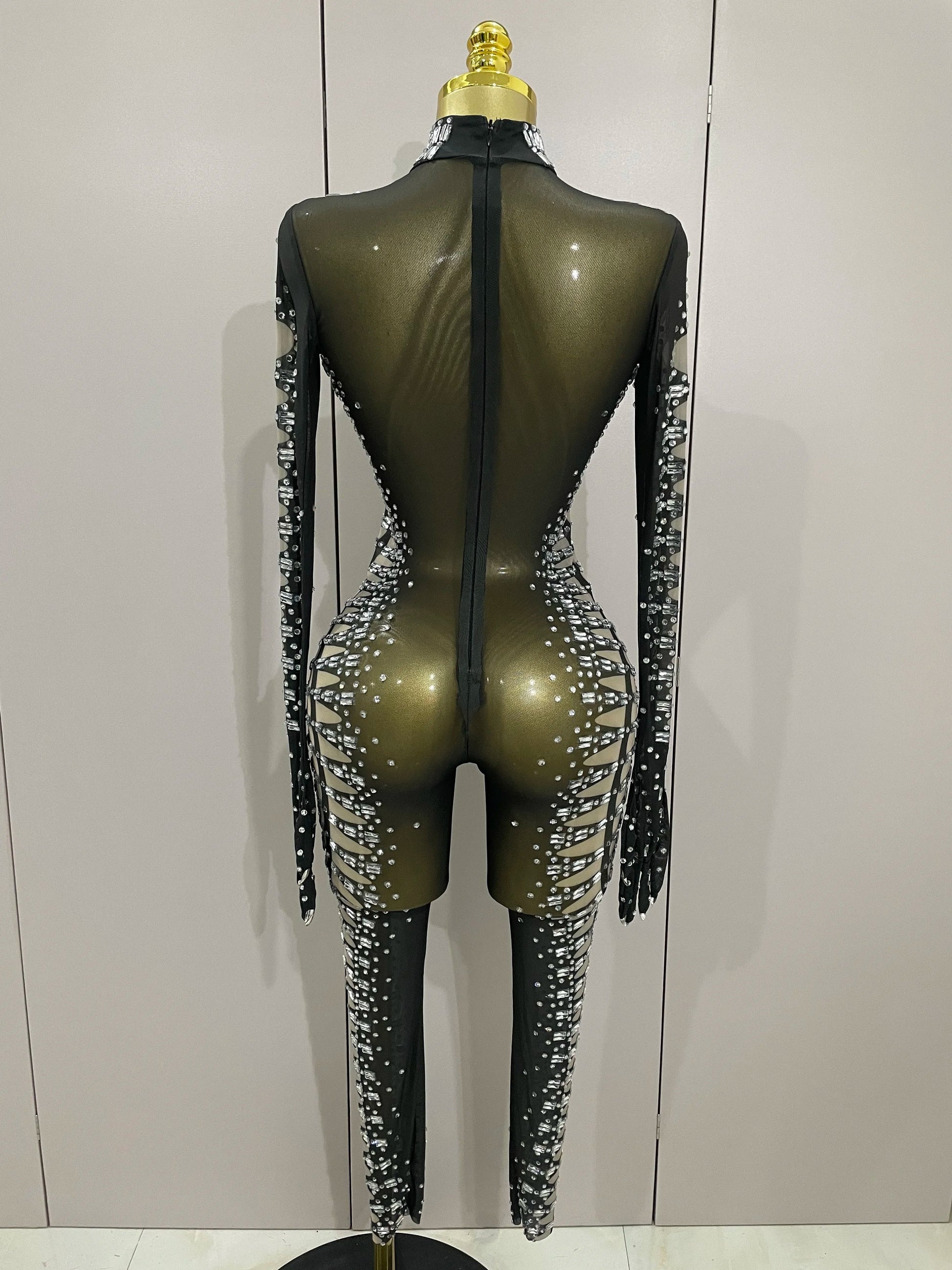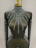 Sexy Sparkly Crystals Black Mesh Jumpsuit With Gloves Women Celebrate Birthday Party NightClub Singer Dance Stage Costumes