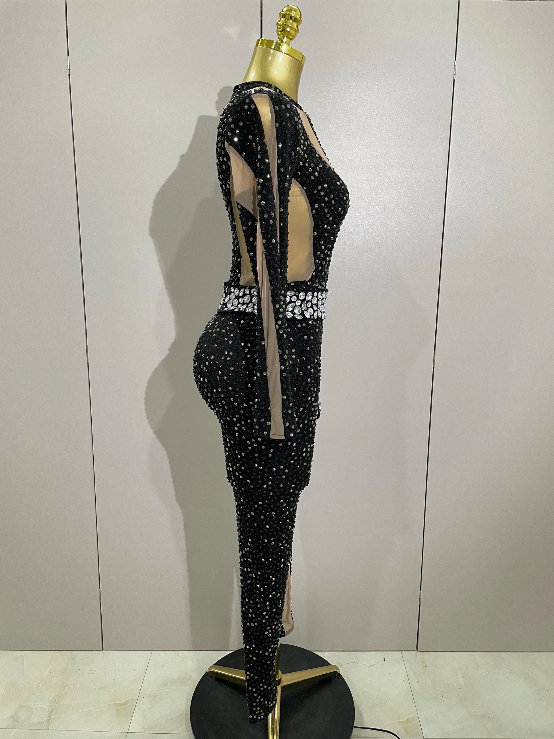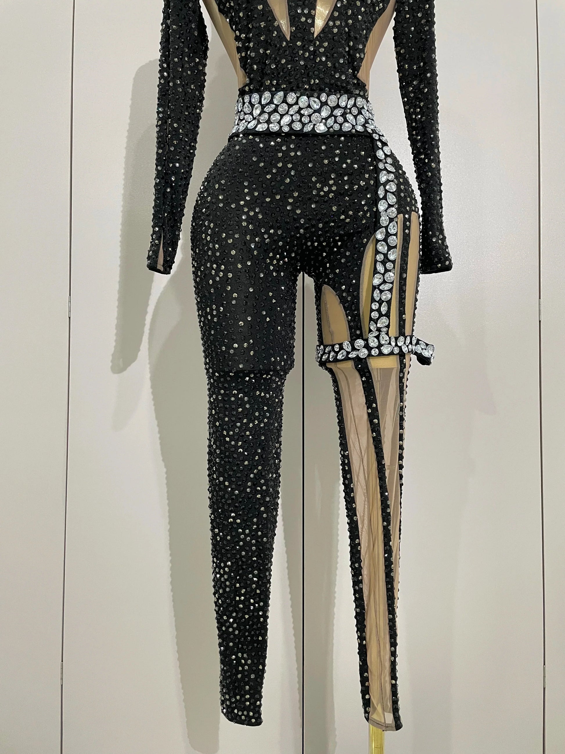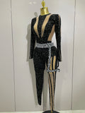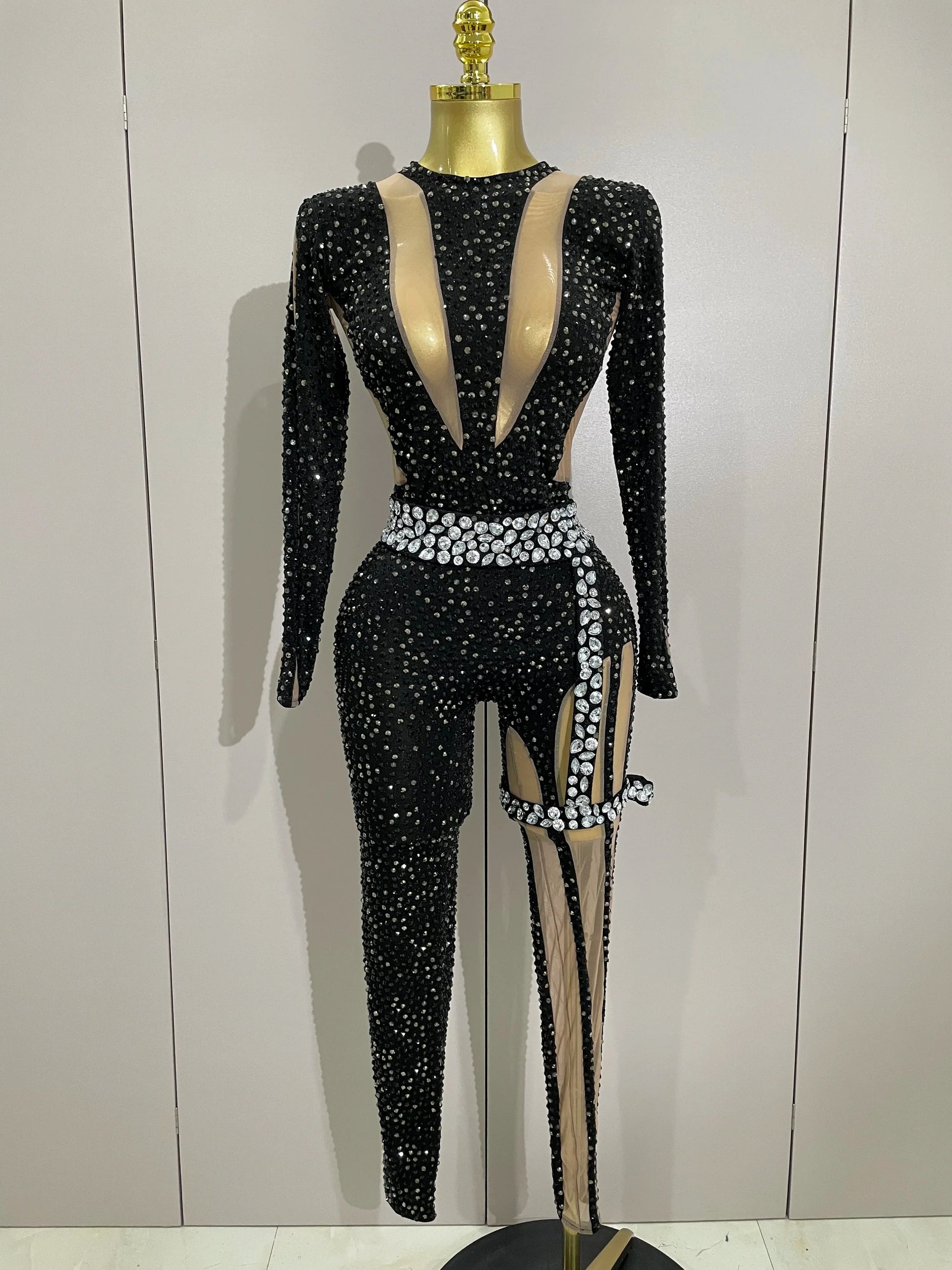 Sexy Sparkly Full Diamond Black Perspective Waist Cinching Asymmetrical Mesh Jumpsuit Birthday Party Nightclub Stage Costume