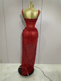 Sparkly Red Rhinestones Sequins Sexy See Through 2PCS Long Dress Women Celebrate Evening Birthday Party Dress Stage Costumes