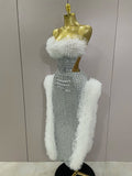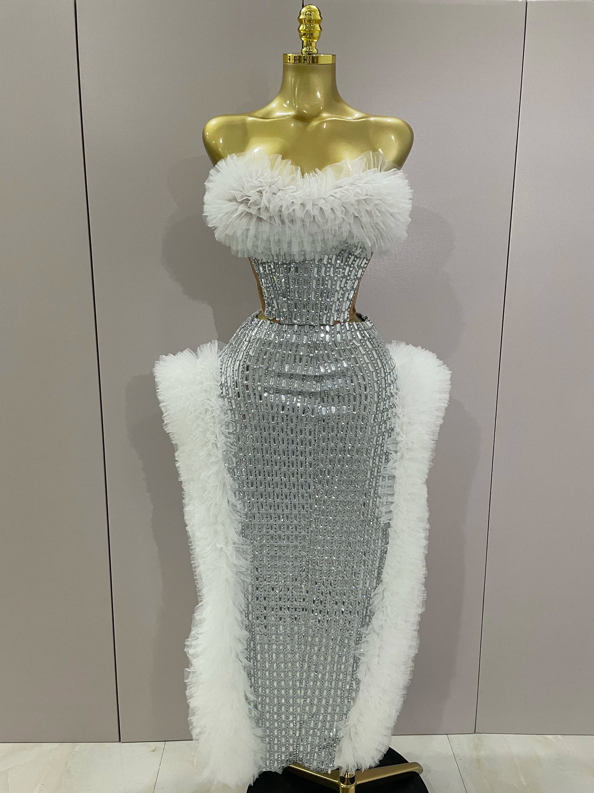 Sparkly Rhinestone Sexy Strapless Tops Skirt 2 PCS Set Women Celebrate Evening Prom Birthday Dress Nightclub Stage Outfit