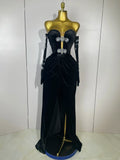 Sparkly Rhinestones Mesh Sexy Split Velvet Gloves Long Dress Women Birthday Celebrate Wedding Gown Stage Photo Shoot Wear