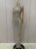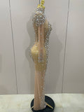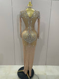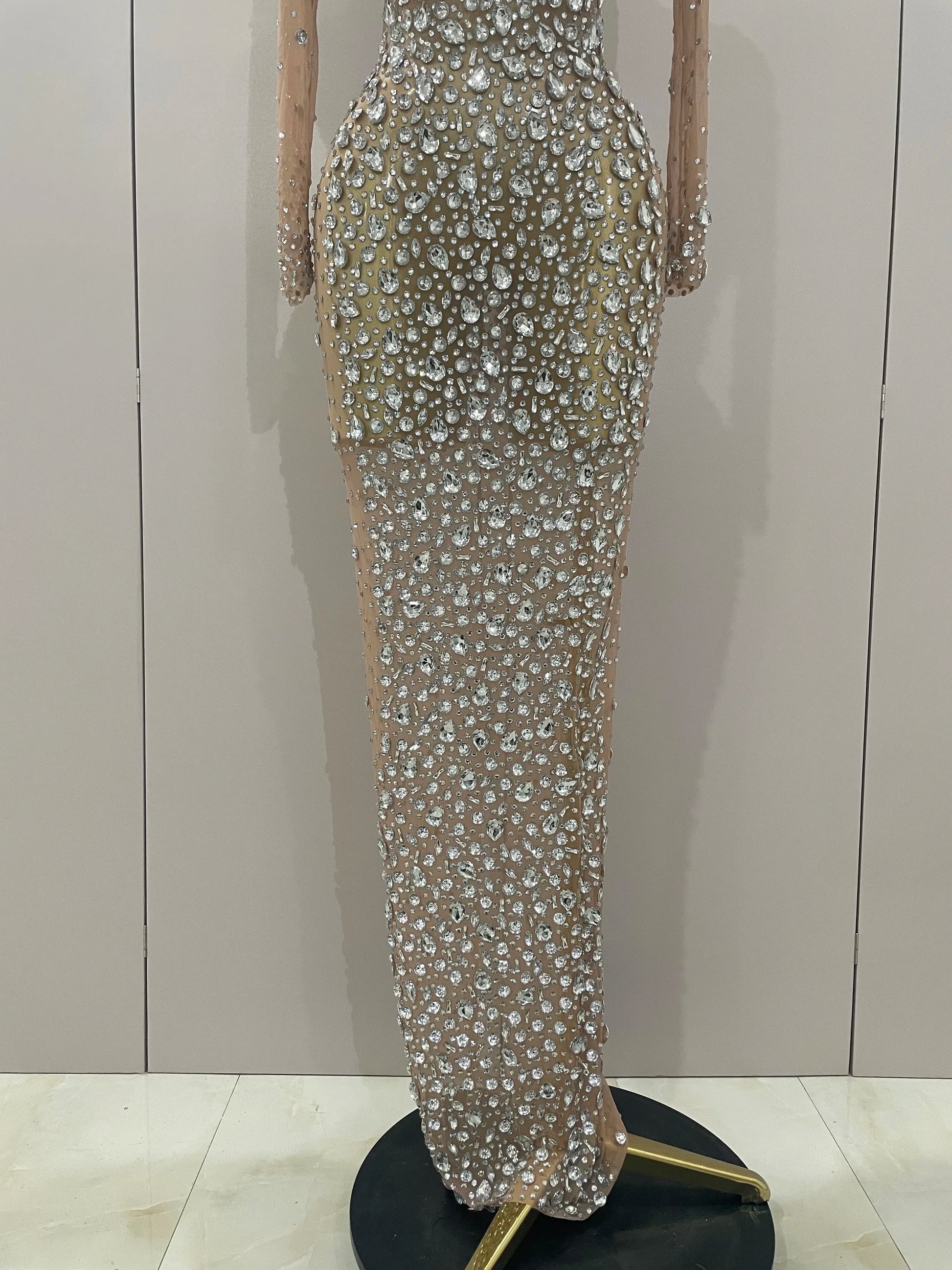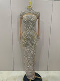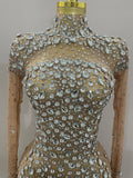 Sparkly Silver Big Rhinestone Sexy Transparent Long Dress Women Evening Birthday Party Celebrate Club Dancer Stage Costume