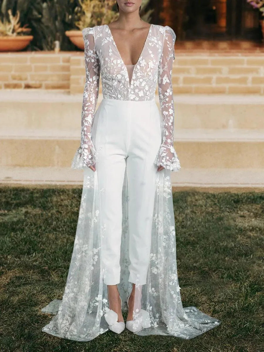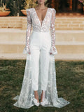 Witte jumpsuit strand trouwjurken juweel hals lange mouwen rugloos enkel lengte bruidsoutfit kant zomer trouwjurken