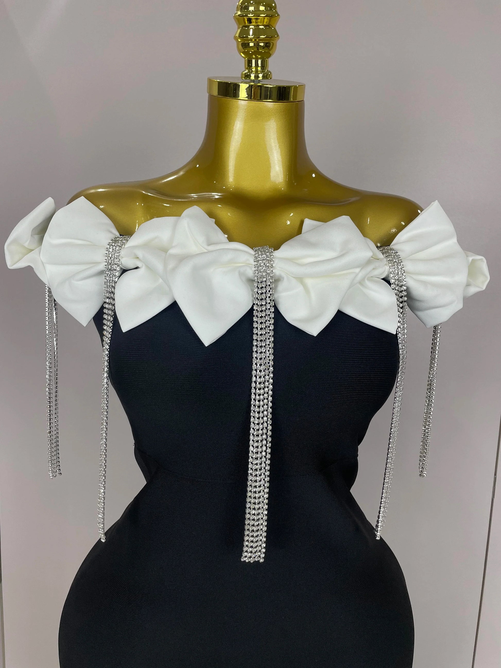Women Celebrity Sexy Off Shoulder Flower Diamonds Black Bow Tie Maxi Long XL Bandage Dress Elegant Evening Club Party Dress