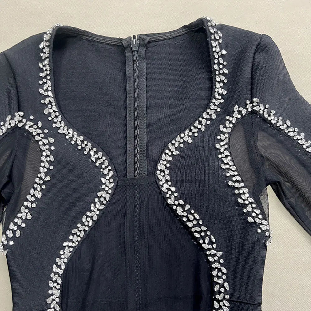 2024 Autumn Women's Light Luxury Diamond Mesh Patchwork Bandage Dress Long Sleeve Bodycon Tail Dresses Evening Party Vestidos