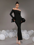 2024 Elegant Women's Black Maxi Dress Stand up Neck Flare Sleeves Bodycon Bandage Long Dresses Cocktail Evening Party Vestidos