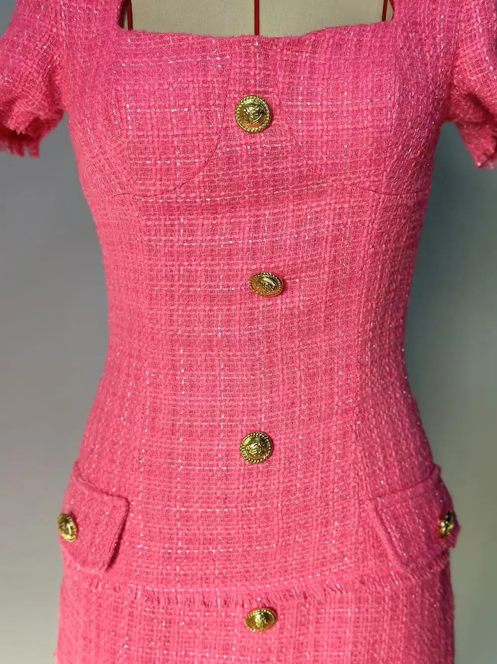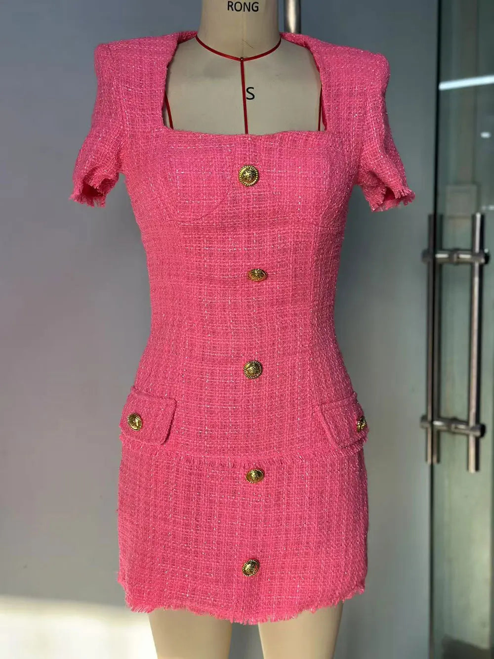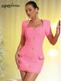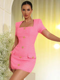 2025 Elegant Women's Small Fragrant Dress Square Neck Short Sleeve Button Design Bodycon Mini Dress Evening Party Vestidos