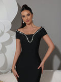 2025 New Sexy Off Shoulder Diamond Tight Bandage Maxi Long Dress Women's Short Sleeve Elegant Celebrity Evening Party Gowns