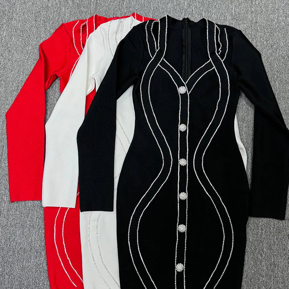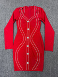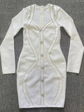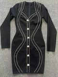 2025 Spring Elegant Women Diamond Set Bandage Dress V-neck Long Sleeve Bodycon Single breasted Mini Dress Evening Party Vestidos