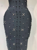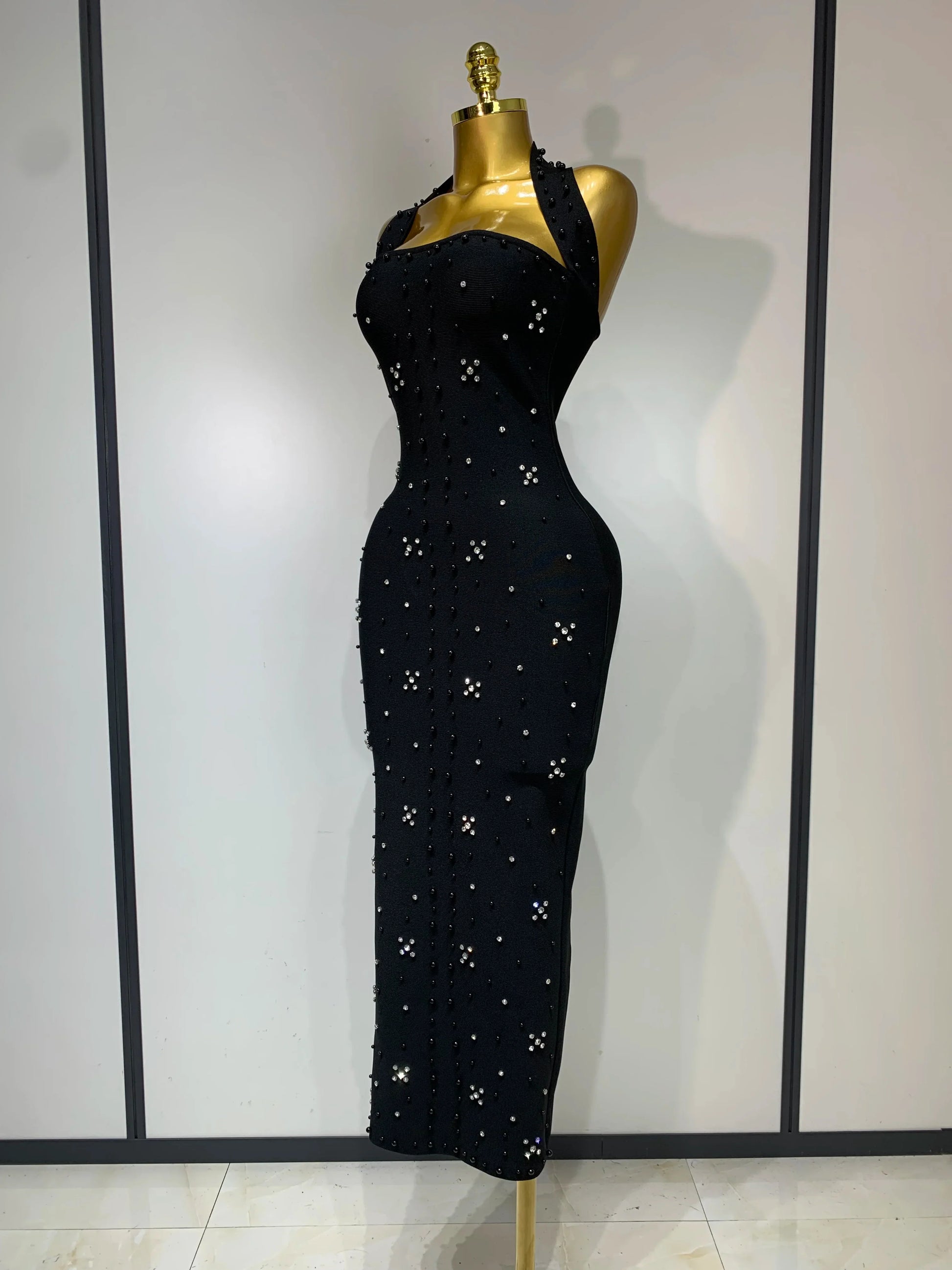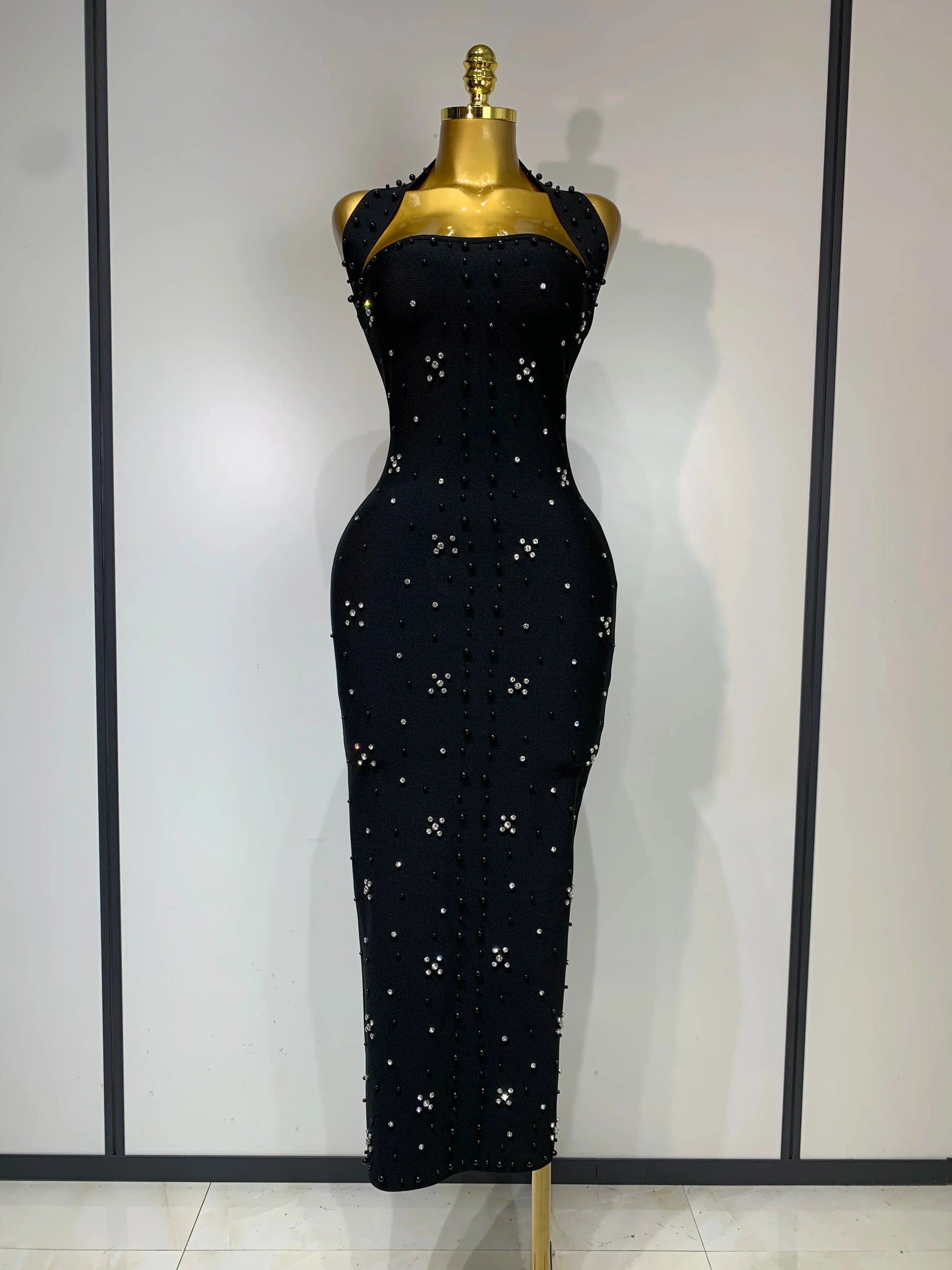Elegant Sparkly Rhinestone Pearl Halter Backless Bodycon Bandage Long Dress Women Luxury Birthday Evening Party Gowns