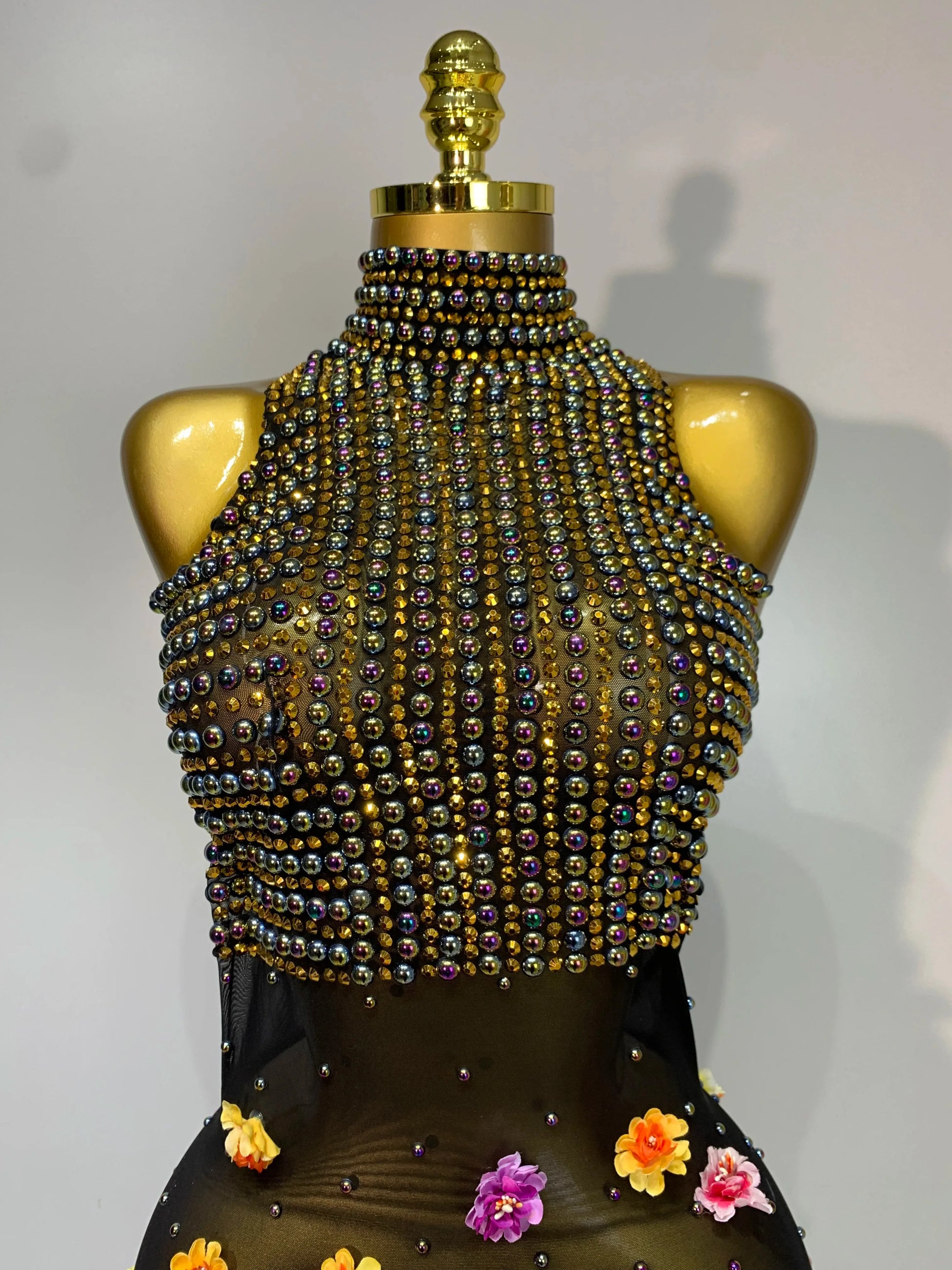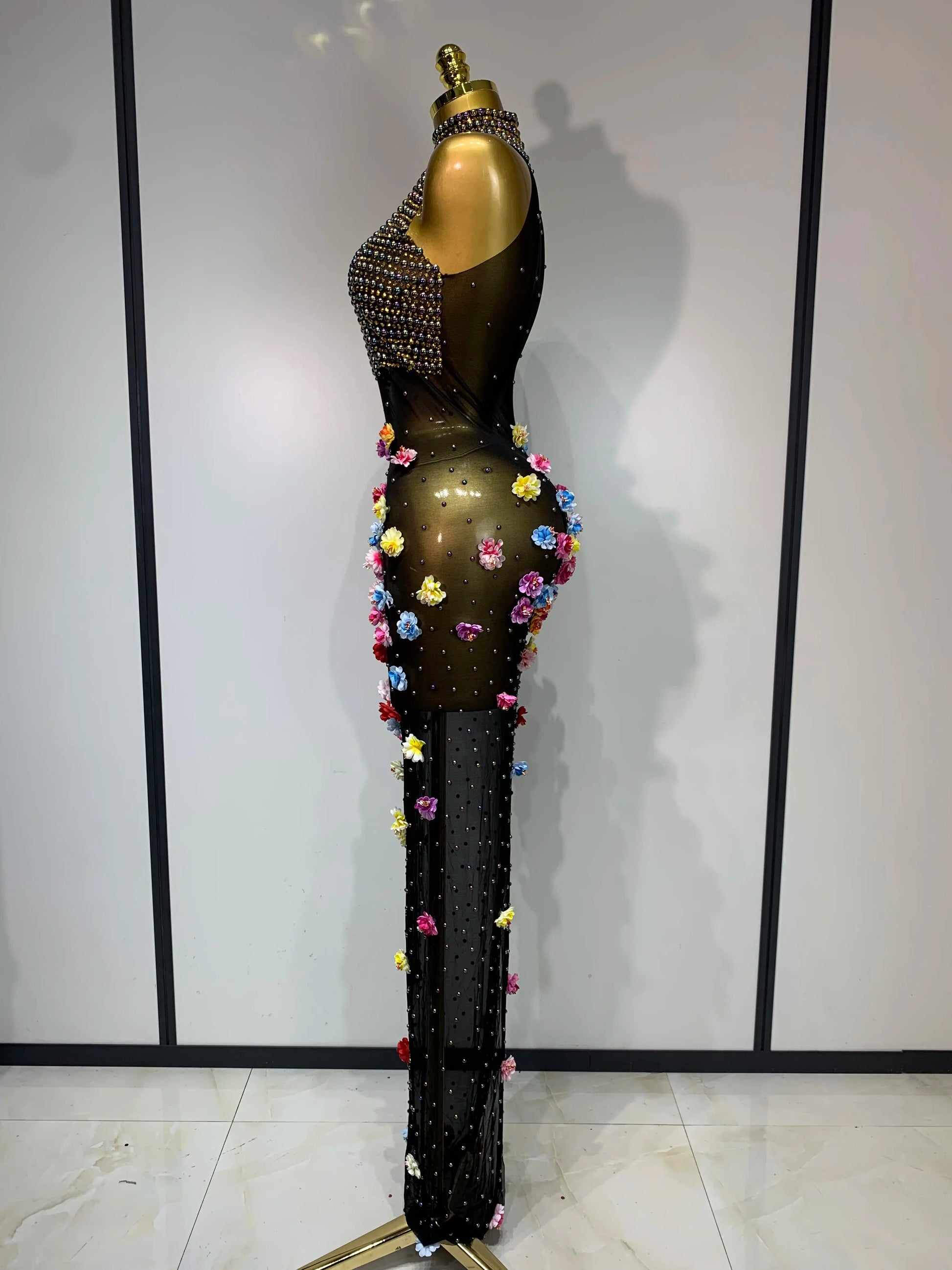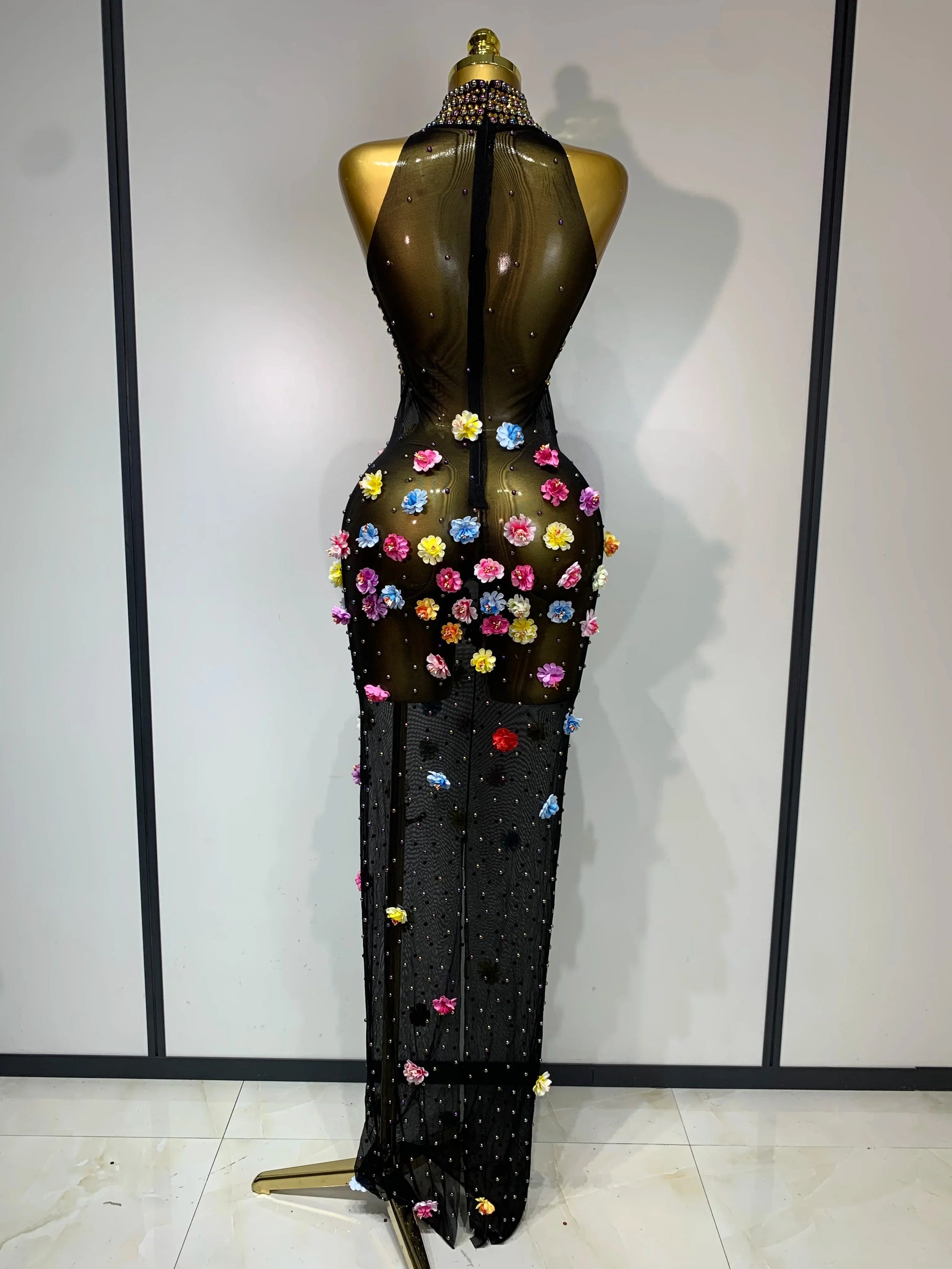 Luxury Rhinestones Flowers Sexy See Through Long Dress Elegant Evening Party Birthday Wedding Guest Dress Club Stage Outfit