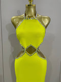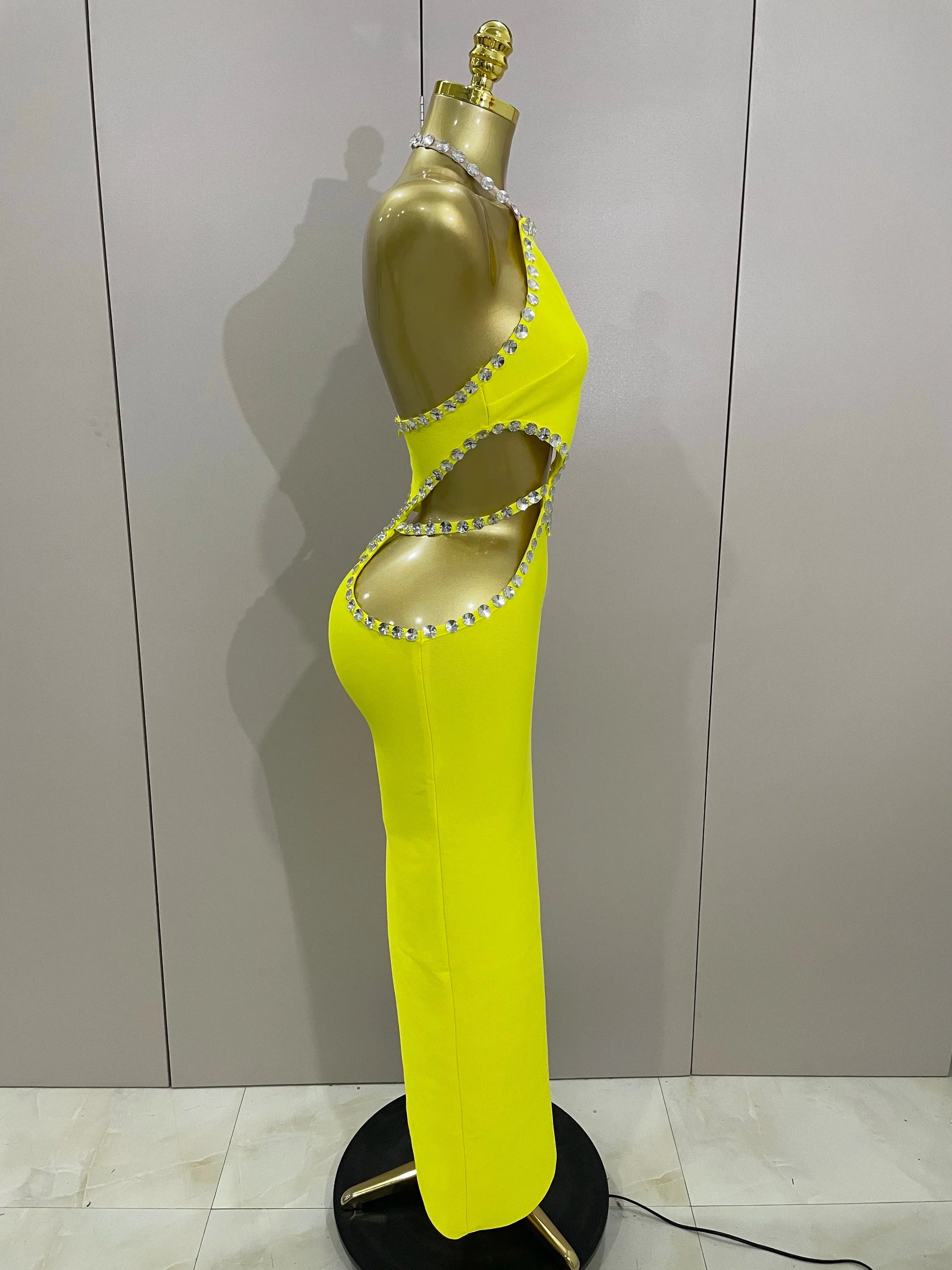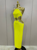 Luxury Sexy Backless Halter Beading Maxi Long Lemon Yellow Bandage Dress Women Elegant Evening Club Birthday Party Dress