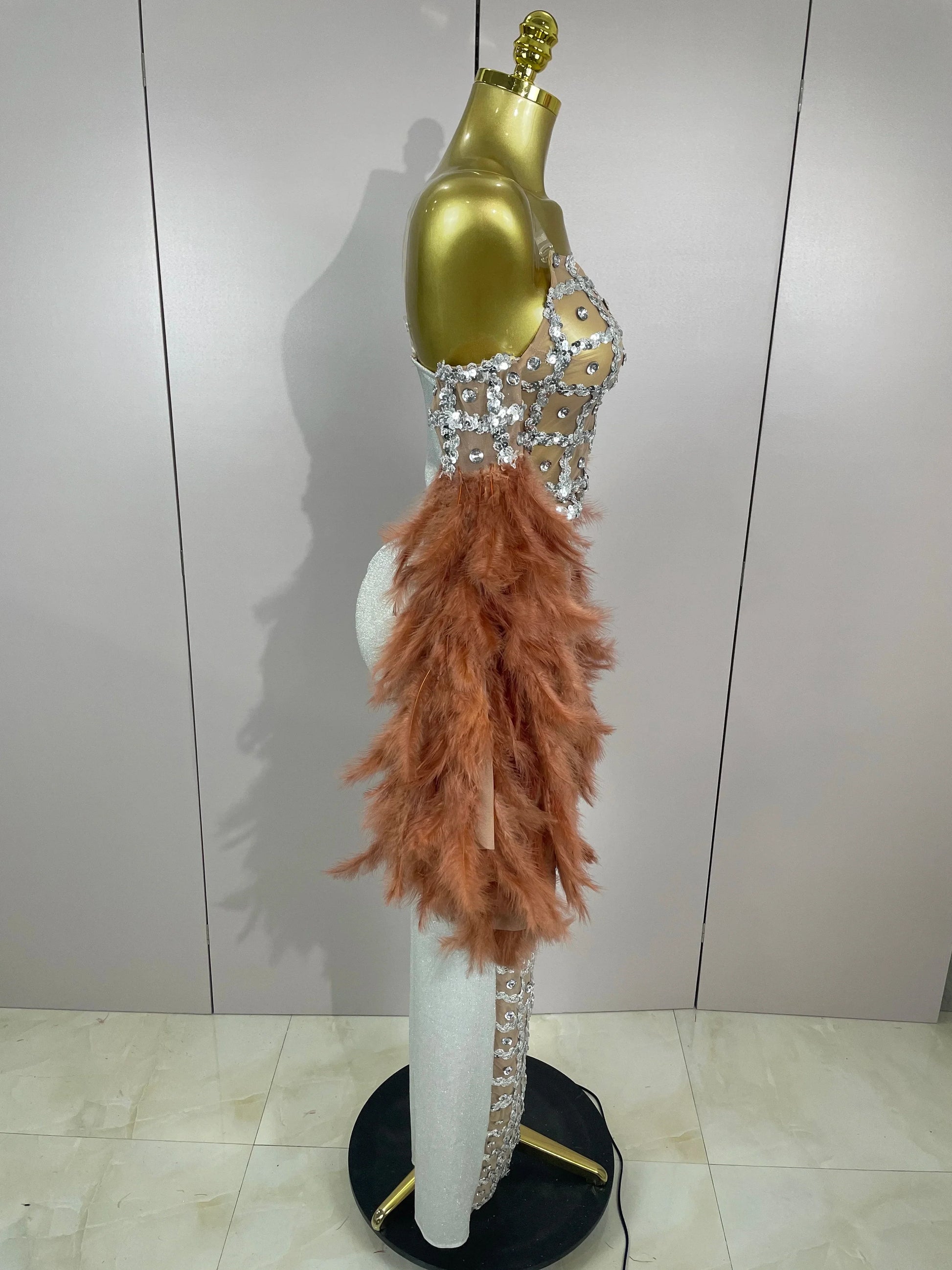 Luxury Sparkling Diamond Feather Mesh Tight Sexy Mesh Long Dress Women Birthday Party Nightclub Stage Performance Costume
